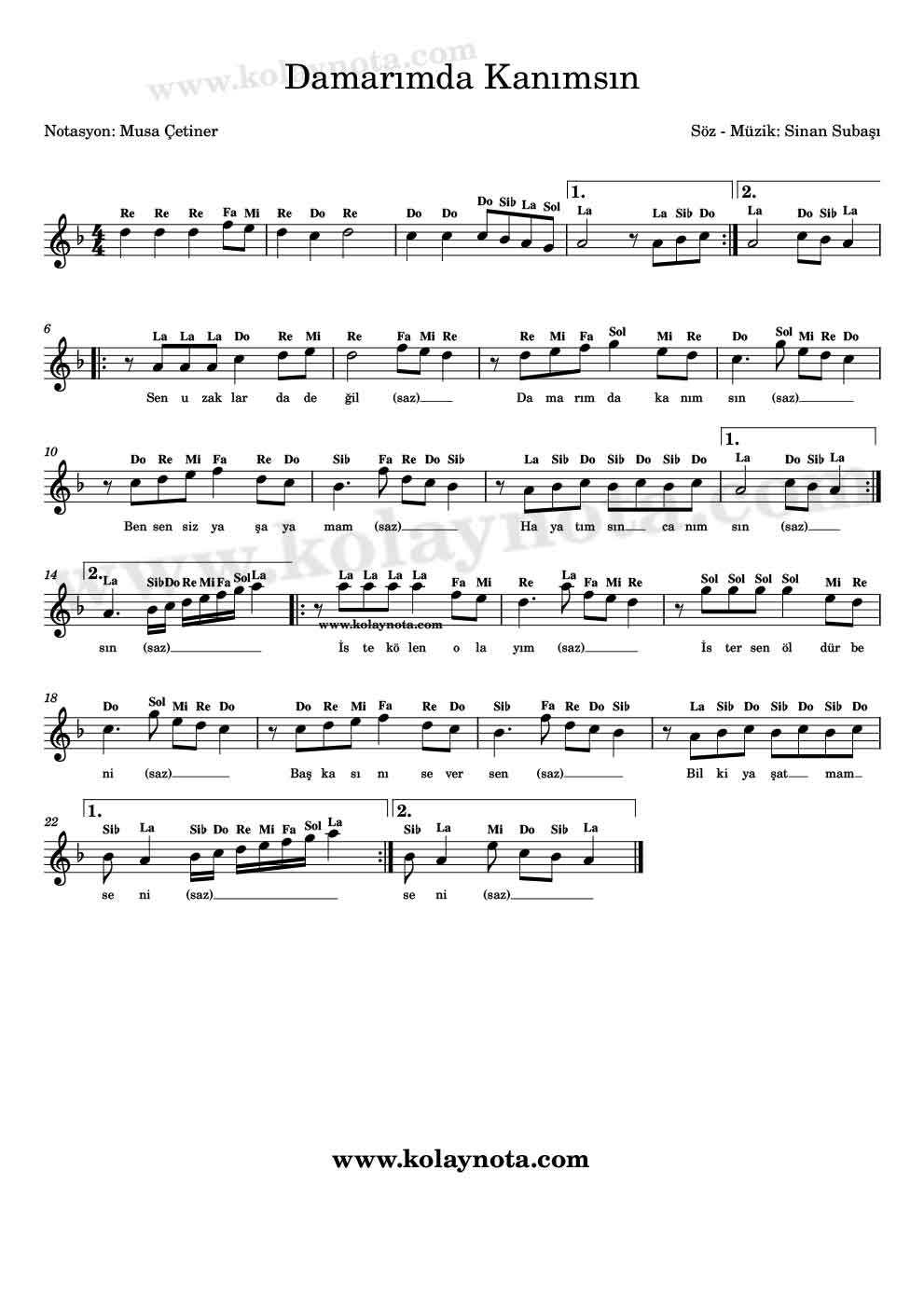 Damarımda Kanımsın; bugüne kadar birçok sanatçı tarafından yorumlanmış, muhayyerkürdi makamında bir eser. Şarkının bestesi ve sözleri Sinan Subaşı‘ya ait. Do Re Mi nota ve kolay nota biçiminde paylaşacağım. Do re mi nota mi karar, kolay notası la karar olacak. İşinize yarayan versiyonu çalabilirsiniz.