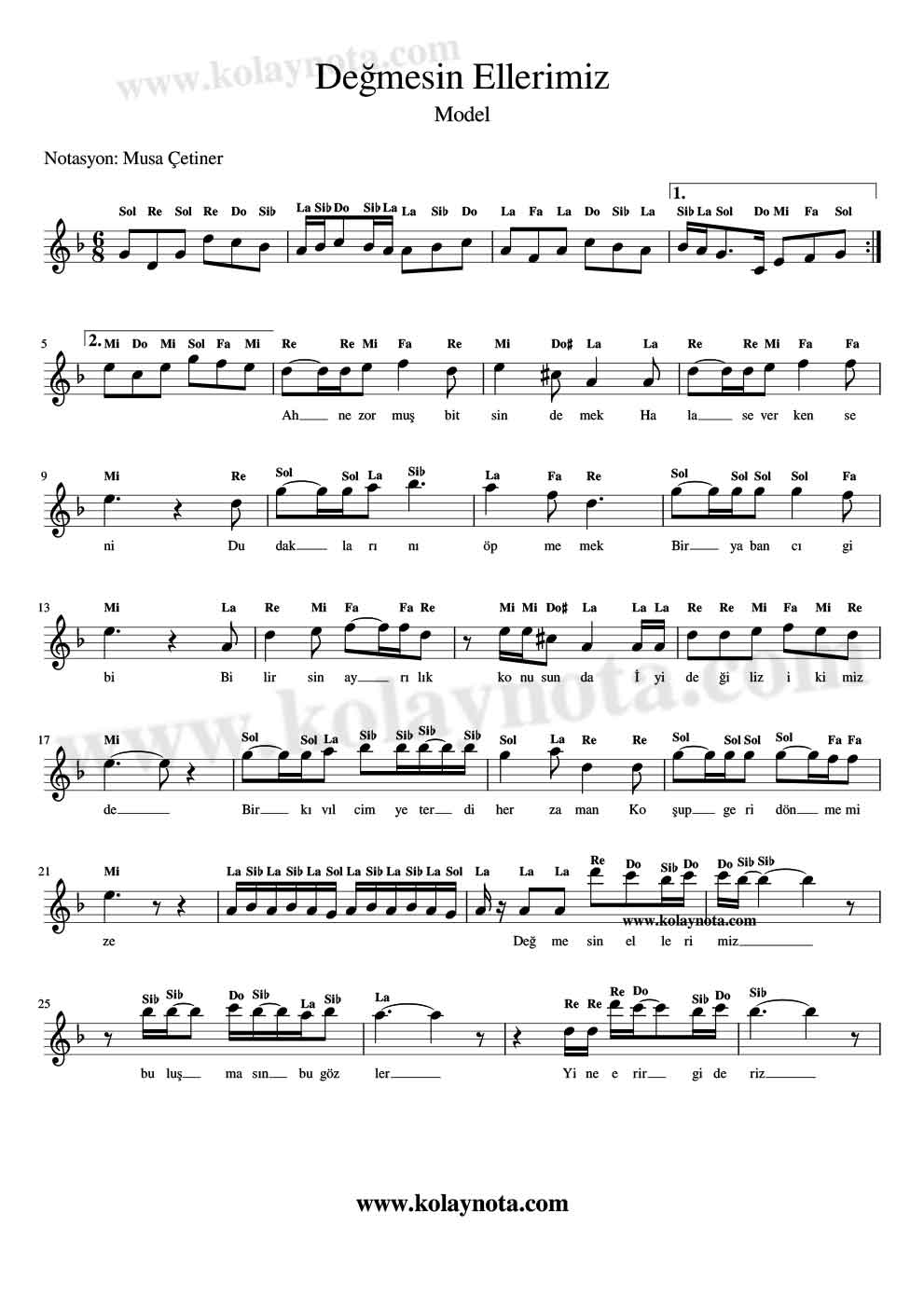 Değmesin Ellerimiz Notaları » Model grubunun en sevilen ve bilinen eseri. Şarkı Re Minör tonunda, ben de notayı aynı tonda ekliyorum. Tiz notaları okumakta zorlanabilirsiniz belki. Şarkıyı Kolay Nota olarak ekliyorum, yani nota isimleri üstlerinde yazıyor.