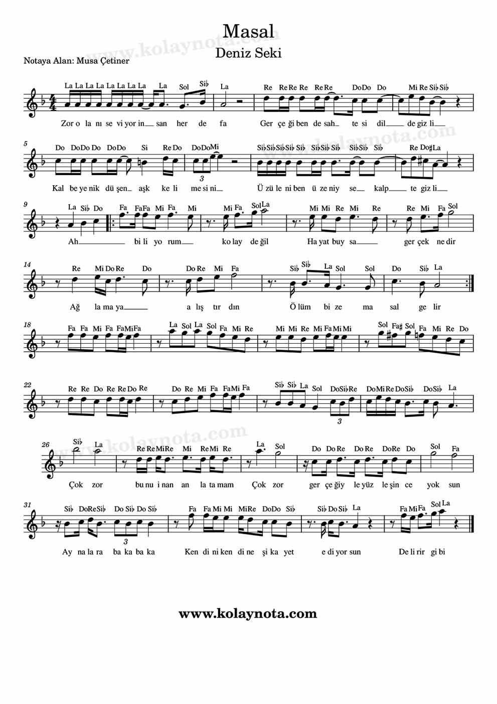 Masal, Nota. Deniz Seki’nin bir şarkısı. Kürdi dizisi üzerine bestelenmiş. Si karar sesinde yorumlanmış, ben La karar sesinde notaya aldım. Keman, piyano, melodika, flüt, org gibi çalgılarda çalabilir, notayı dinleyebilir, PDF ve Jpg biçiminde görüntüleyerek doğru bir şekilde çalışabilirsiniz.