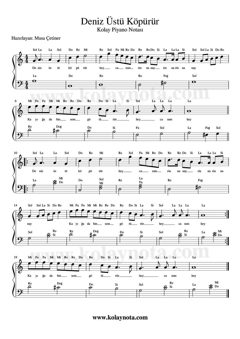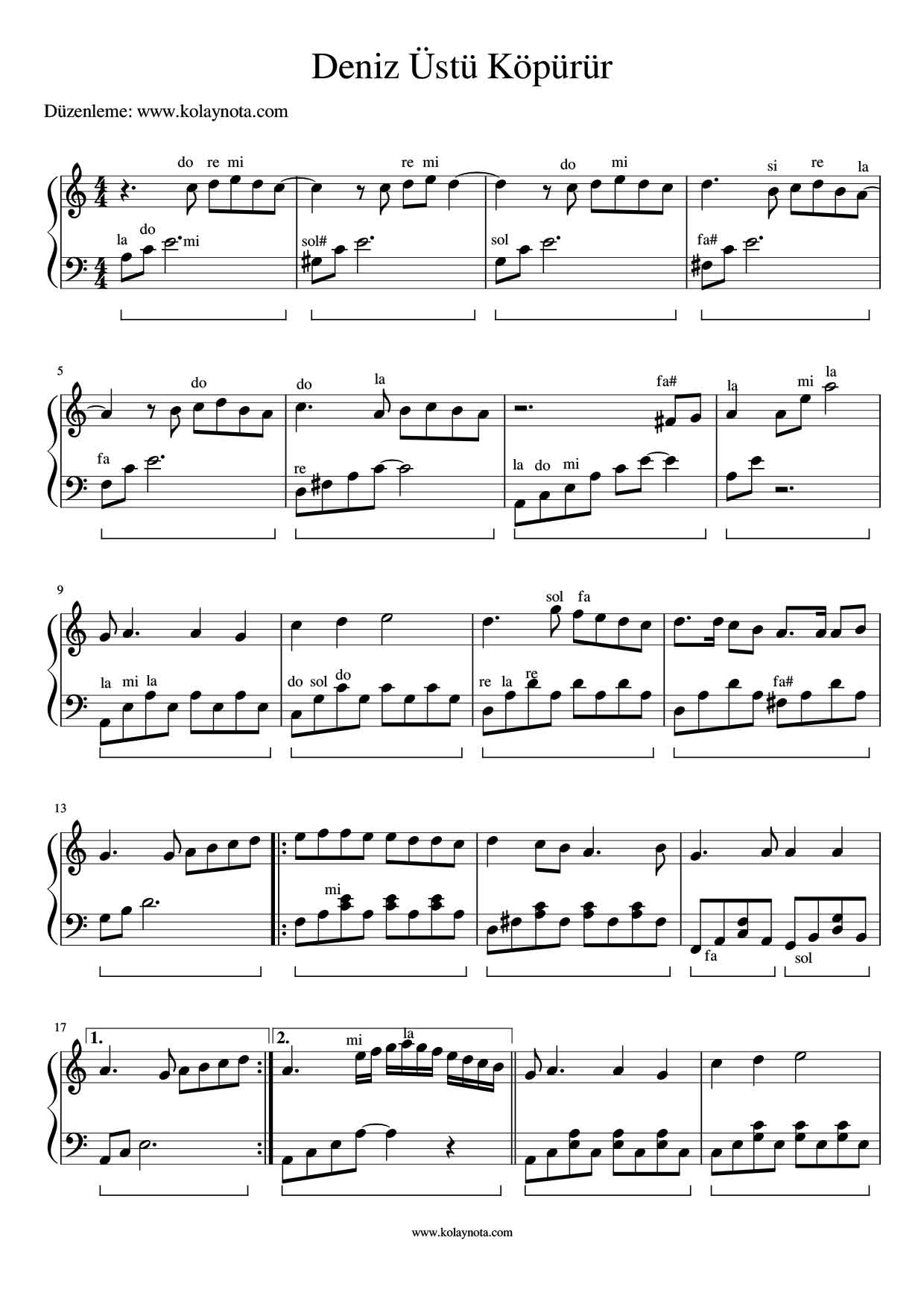 Deniz Üstü Köpürür hepimizin çok sevdiği bir türkü. Piyano notalarını paylaşacağım. 2 versiyon var, biri zor, diğeri de kolay, yeni başlayanlar için. Her iki notasyonun da video linkini ekleyeceğim, izlemeyi ihmal etmeyin. Youtube kanalıma da abone olursanız sevinirim. Teşekkürler