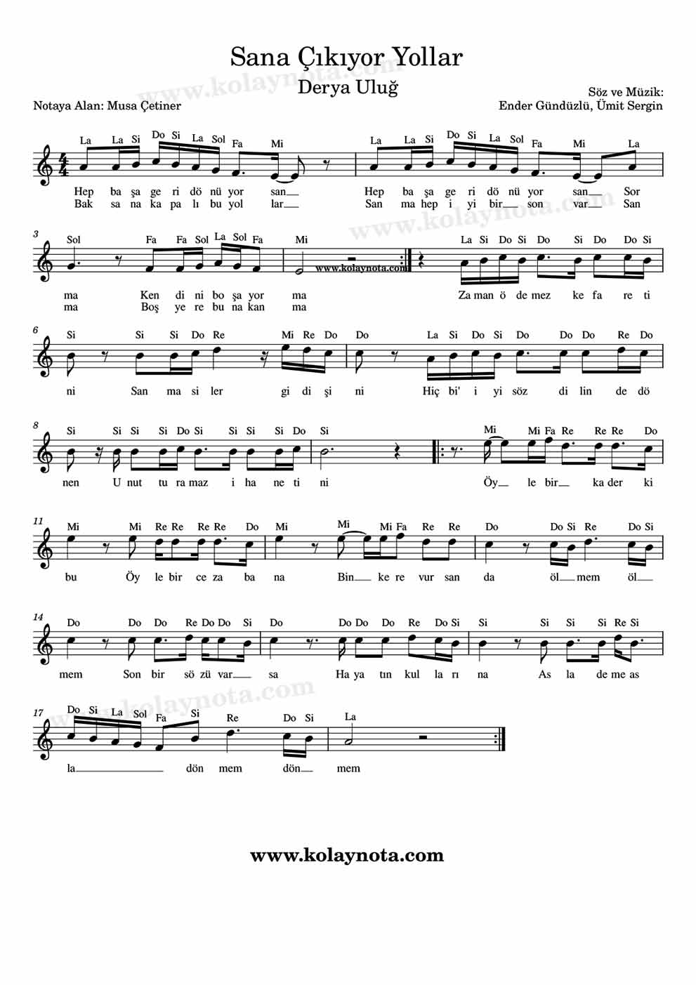 Sana Çıkıyor Yollar, Nota. Sözü, müziği Ender Gündüzlü ve Ümit Sergin’e ait olan, Derya Uluğ’un seslendirdiği bir şarkı. Fa karar sesinde söylenmiş, ben La karar sesinde notaya aldım. Keman, piyano, melodika, flüt, org gibi çalgılarda çalabilir, PDF ve Jpg biçiminde görüntüleyebilirsiniz. Notayı dinleyerek melodi hakkında bir fikir sahibi olabilirsiniz.
