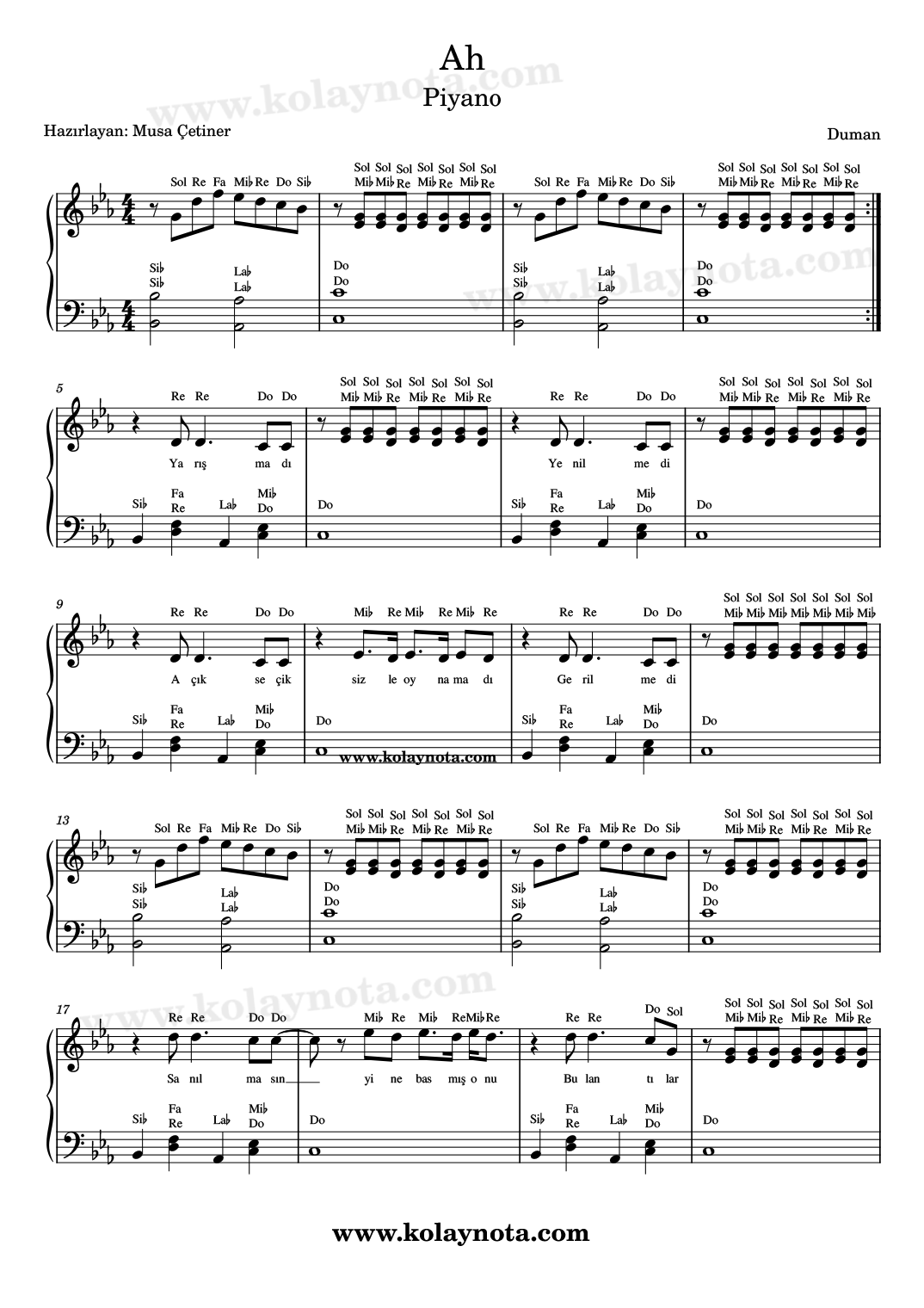 Ah, Nota. Duman grubunun bir şarkısı. Grubun 2002 “Belki Alışman Lazım” albümünde yer almış. Do minör tonunda yorumlanmış aynı tonda kolay nota ve piyano düzenlemesini hazırladım. Keman, melodika, flüt, org gibi birçok çalgıda çalabilir, PDF ve imaj biçiminde görüntüleyebilirsiniz.