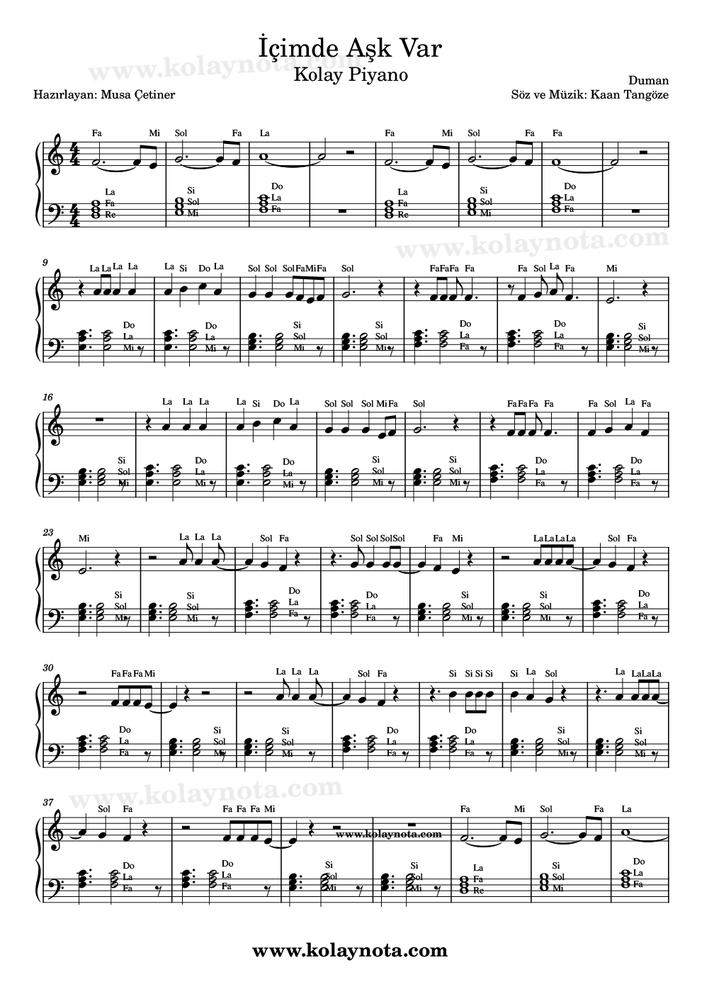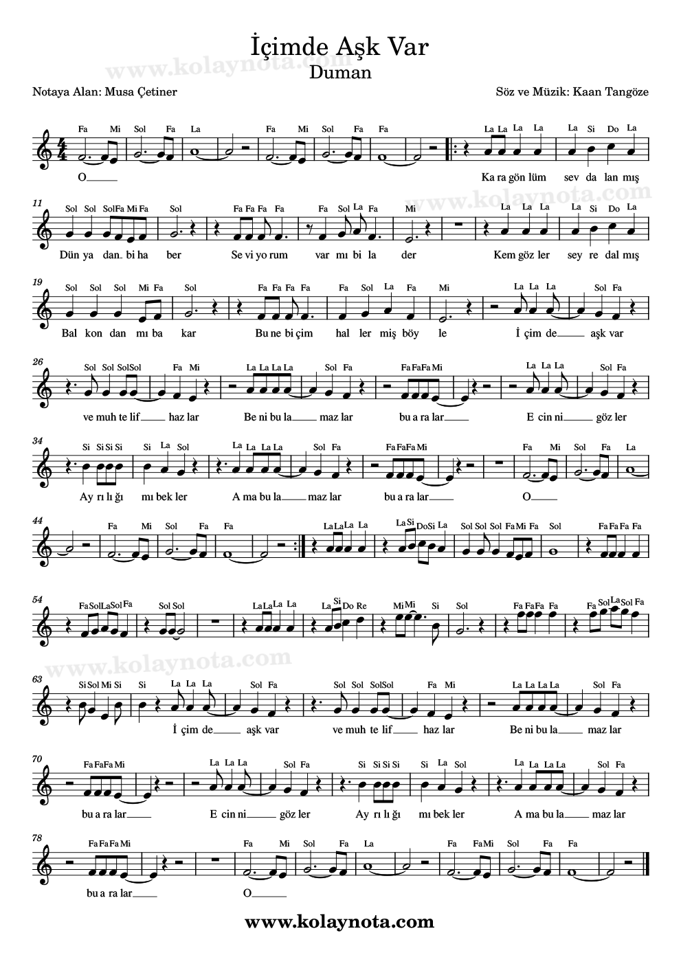 İçimde Aşk Var, Nota. Duman grubunun şarkısı. Kaan Tangöze tarafından bestelenmiş. Fa# karar sesinde yorumlanmış. Ben Mi karar sesinde notaya aldım. Kolay nota ve piyano düzenlemesini görebilirsiniz bu yazıda. Keman, melodika, flüt, org gibi çalgılarda çalabilir, PDF ve imaj biçimlerinde görüntüleyebilirsiniz.