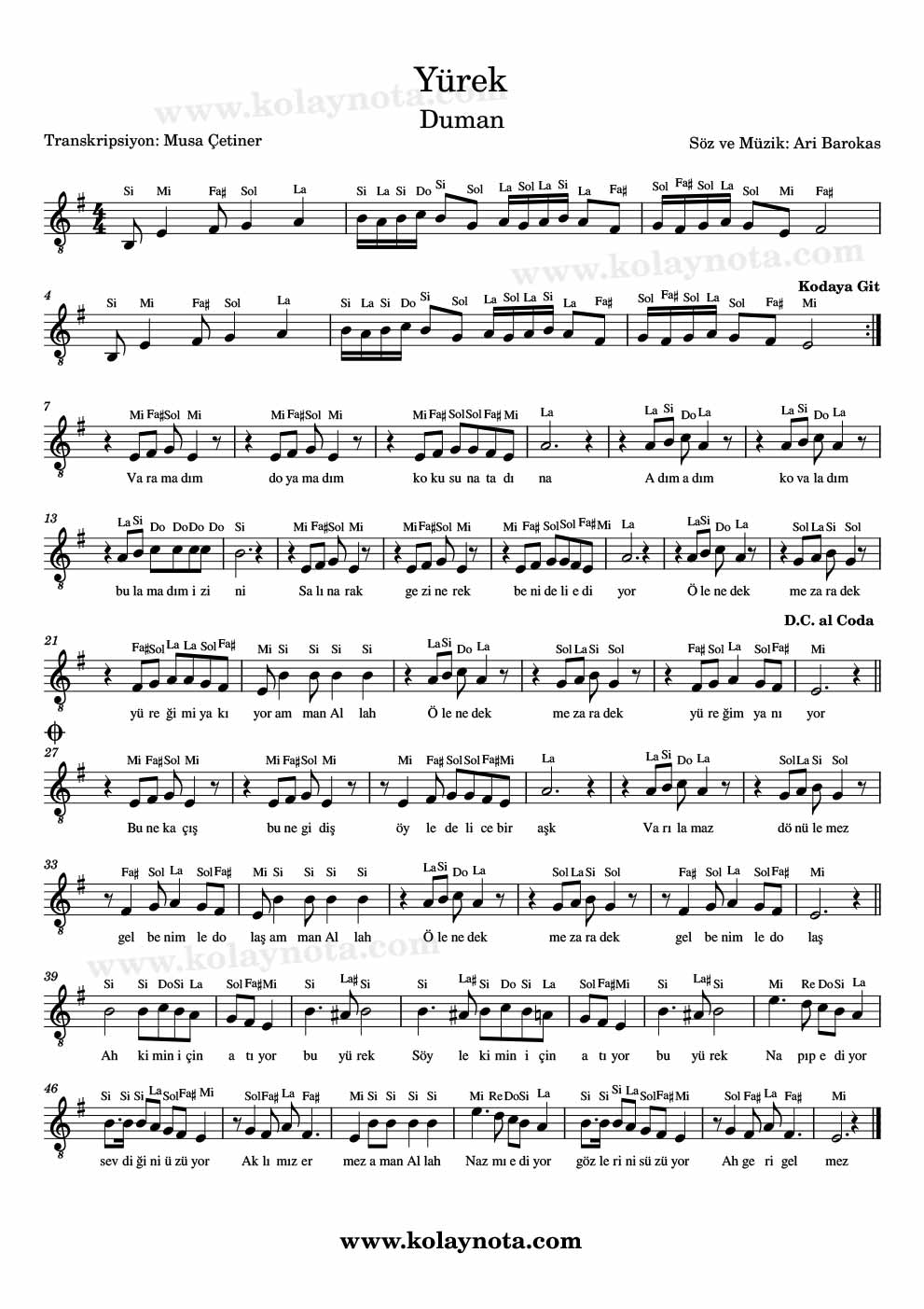 Yürek, Nota. Duman grubunun bir şarkısı. Sözü ve müziği Ari Barokas’a ait. Şarkı grubun 2013 yılında çıkan “Darmaduman” albümünde yer aldı. Mi Karar sesinde söylenmiş, aynı karar seste notaya aldım. Kolay Nota ve piyano düzenlemesini görebilirsiniz.
