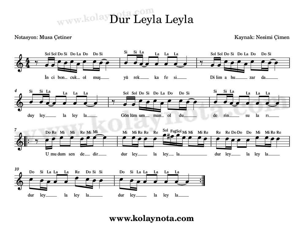 Dur Leyla yada diğer adıyla Deli Gönül Yine Ahuzar Oldu kaynak kişisi Nesimi Çimen olan güzel bir türkü. Buradaki notasyon ve sözler HiraiZerdüş yorumuyla yazıldı. Do Re Mi melodika ve kolay notalarını paylaşacağım çoğunlukla olduğu gibi. Do Re Mi notasyon re karar, kolay notası la karar. Notaları melodika, keman, bağlama, flüt gibi çalgılarda çalabilirsiniz. Başarılar.