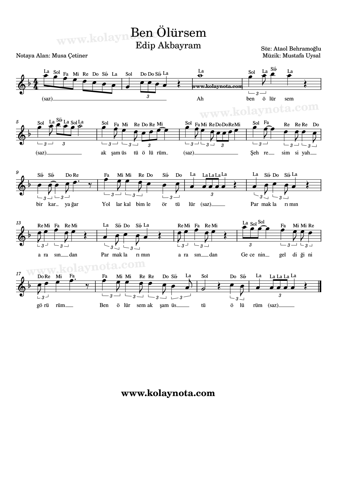 Ben Ölürsem, Nota. Edip Akbayram’ın bir şarkısı. Sözleri Ataol Behramoğlu, bestesi Mustafa Uysal’a ait. Kürdi makamında bir şarkı. La karar sesinde notaya aldım. PDF ve imaj formatında görüntüleyebilir, kemena, piyano, melodika, flüt, bağlama, org gibi bir çok çalgıda çalabilirsiniz.