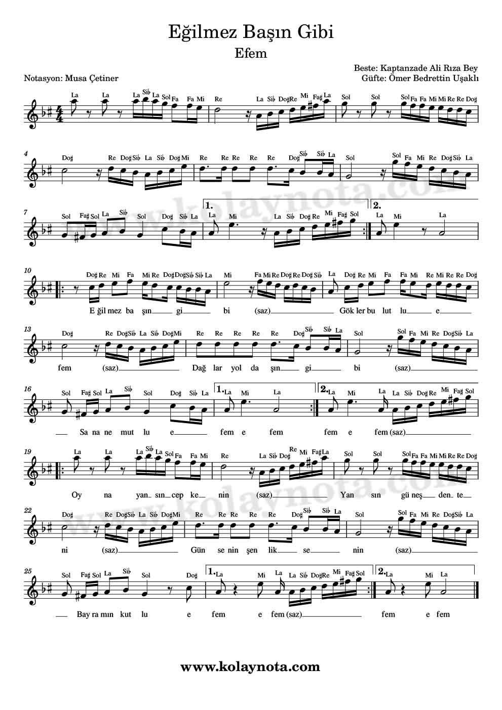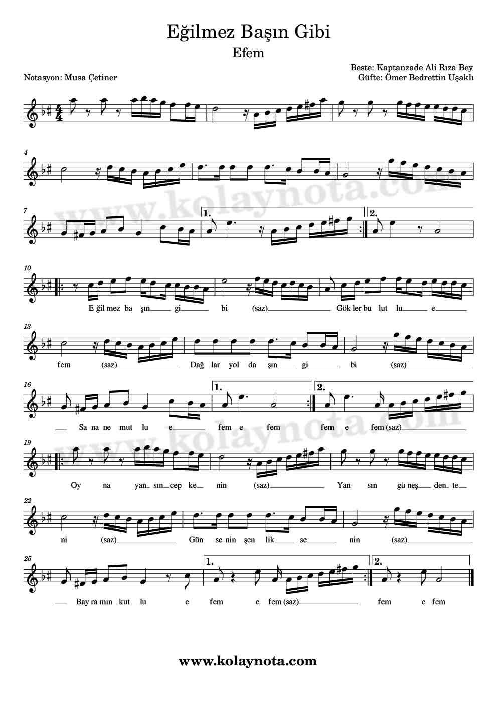 Eğilmez Başın Gibi, diğer adıyla Efem; bestesi Kaptanzade Ali Rıza Bey‘e, güftesi Ömer Bedrettin Uşaklı‘ya ait olan, hicaz makamında bir eser. Şarkının bestecisini Yıldızların Altında şarkısından tanıyoruz bu arada. Do Re Mi nota, kolay ve standart notalarını paylaşacağım bu yazıda. Do Re Mi notaları Re karar, kolay ve standart notalarını La karar sesinde yazdım. Bu güzel şarkıyı melodika, keman, flüt, bağlama, org çalgılarında çalabilirsiniz. Bağlama çalan arkadaşlar kolay notasını çalmalılar. Başarılar.