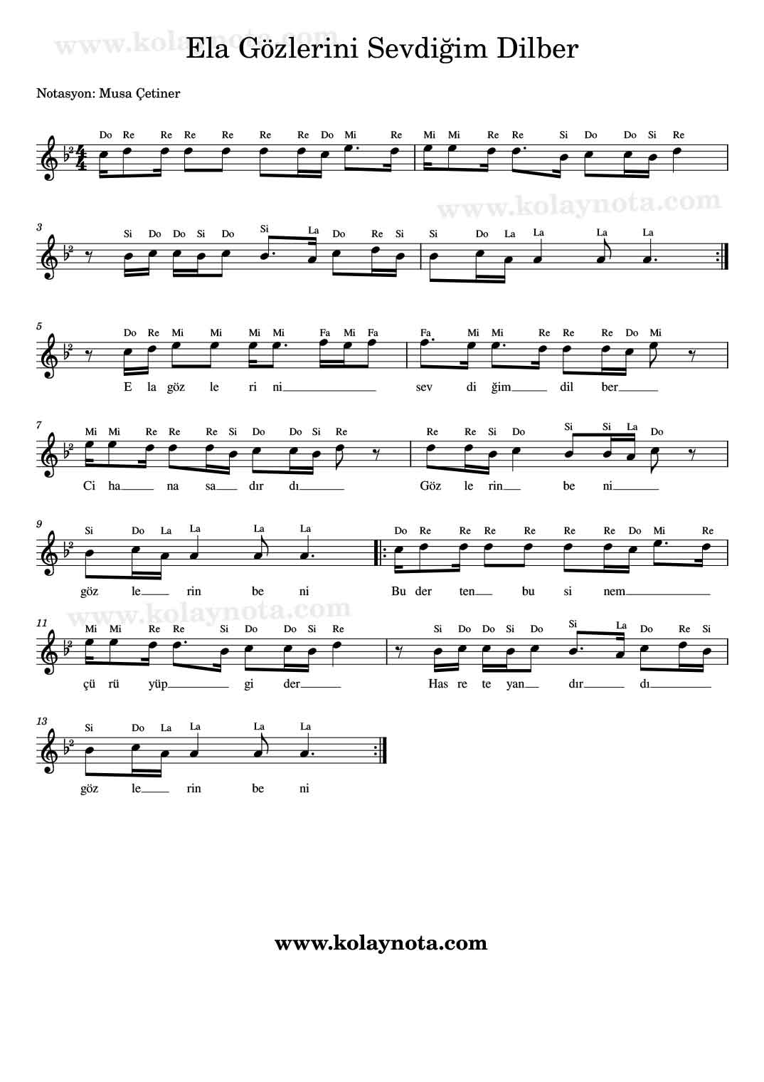 Ela Gözlerini Sevdiğim Dilber Nota. Erzurum yöresine ait, kaynak kişisi Davut Sulari olan bir türkü. Hüseyni makamında ve 4/4 ölçü birimine sahip. Hüseyni makamında olduğu için Türk müziği çalgılarında Si notalarını Bemol 2 çalmalısınız.
