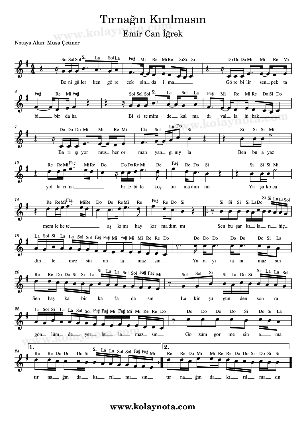 Tırnağın Kırılmasın, Nota. Sözü ve müziği Emir Can İğrek’e ait olan bir şarkı. Si karar sesinde söylenmiş, aynı karar seste notaya aldım. Kolay notasını görebilirsiniz bu yazıda. PDF ve imaj biçiminde görüntüleyebilir, keman, melodika, flüt, org gibi çalgılarda çalabilirsiniz.