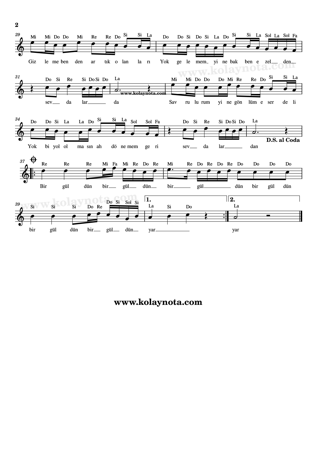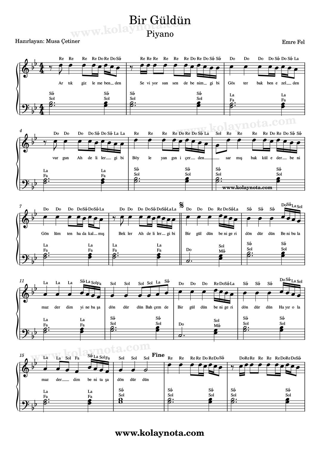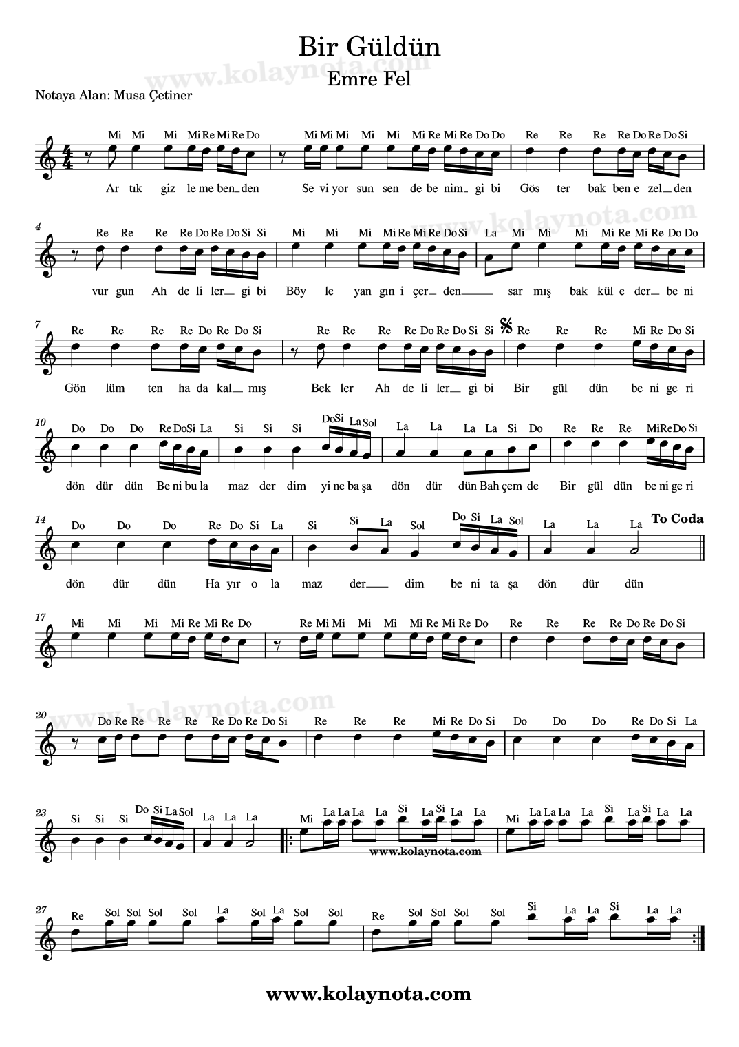 Bir Güldün, Nota. Emre Fel’in bir şarkısı. Sol karar sesinde yorumlanmış. Ben La karar sesinde kolay notasını ve orjinal karar seste piyano düzenlemesini hazırladım. Keman, melodika, flüt, org gibi birçok çalgıda çalabilir, PDF ve imaj biçiminde görüntüleyebilirsiniz.