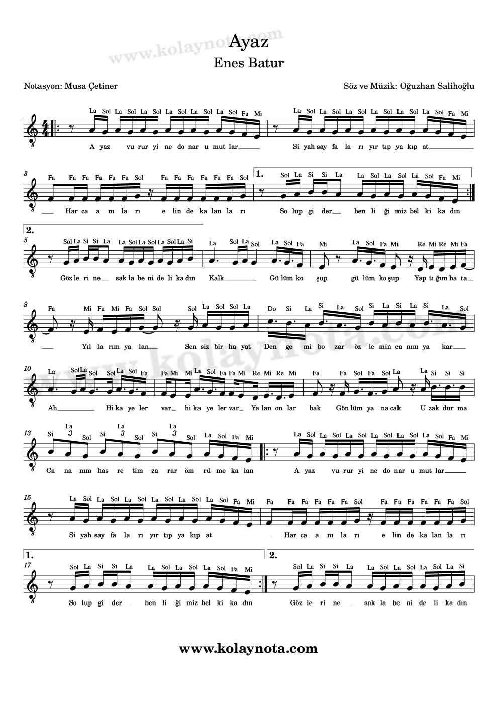 Ayaz; Enes Batur‘un son çıkan şarkısı. Şarkının bestesi ve sözleri Oğuzhan Salihoğlu‘na ait. Şarkının orjinal tonu Do# minör, bu tonda çalmanız zor olacağı için daha kolay çalabileceğiniz La minör tonunda notaları yazdım. Do Re Mi notaları ve Kolay notalarını ve Piyano Notalarını paylaşıyorum.