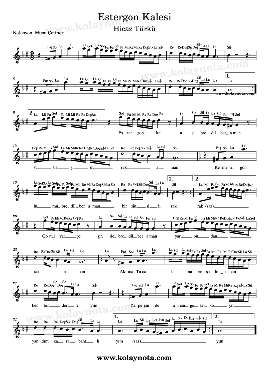 Estergon Kalesi, Nota. Rumeli yöresine ait, Hicaz makamında bir türkü. Kaynak kişisi Kemal Altınkaya. La karar sesinde notaya aldım. PDF ve imaj biçiminde görebilir, keman, bağlama, flüt, melodika, org, piyano gibi çalgılarda çalmayı deneyebilirsiniz. Nota çalıcısını da ekliyorum, türküyü bilmiyorsanız mutlaka dinleyiniz.