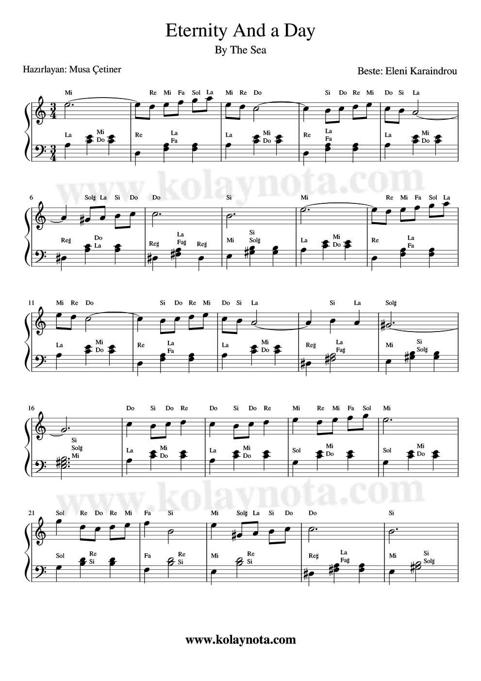 Şarkı Eternity And A Day filminin müziklerinden biri. Asıl adı By The Sea fakat şarkıyı herkes filmin adıyla biliyor sanırım. Bestecisi Eleni Karaindrou. Şarkının tonunu değiştirerek ve akorları biraz daha basitleştirerek yeniden düzenledim. Şarkının video linkini de ekleyeceğim, izleyip doğru bir biçimde çalabilirsiniz. Başarılar.