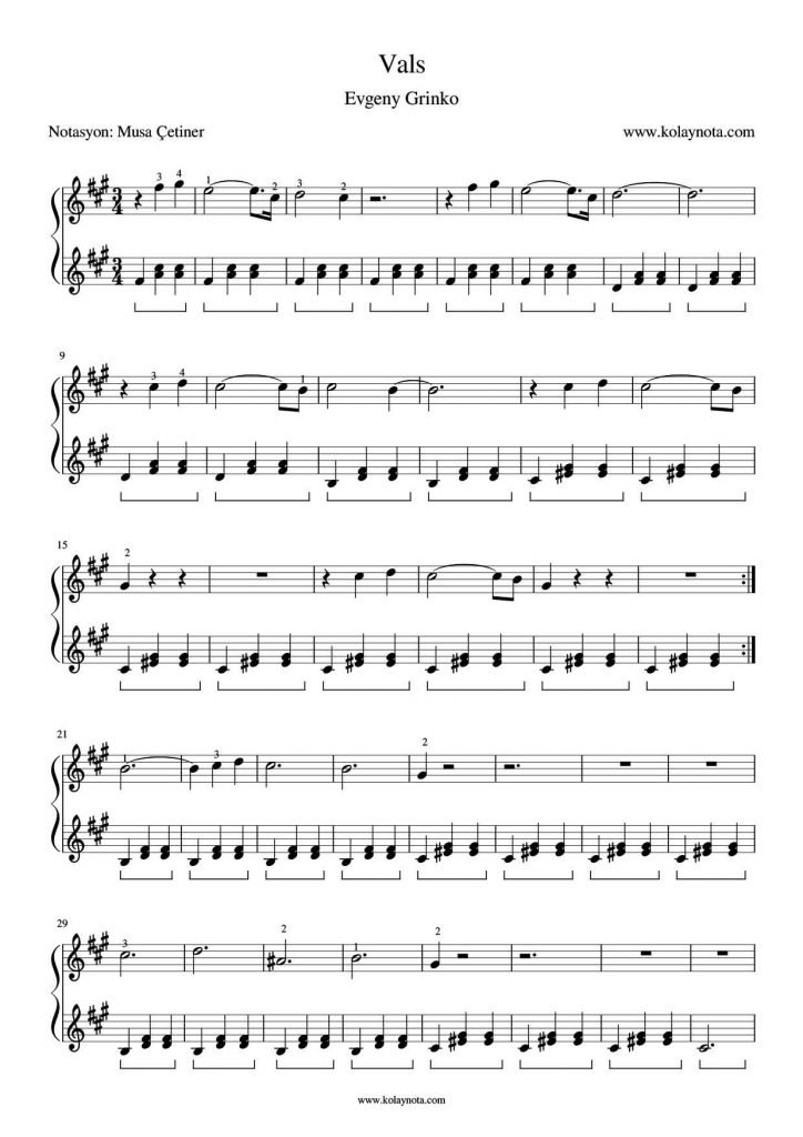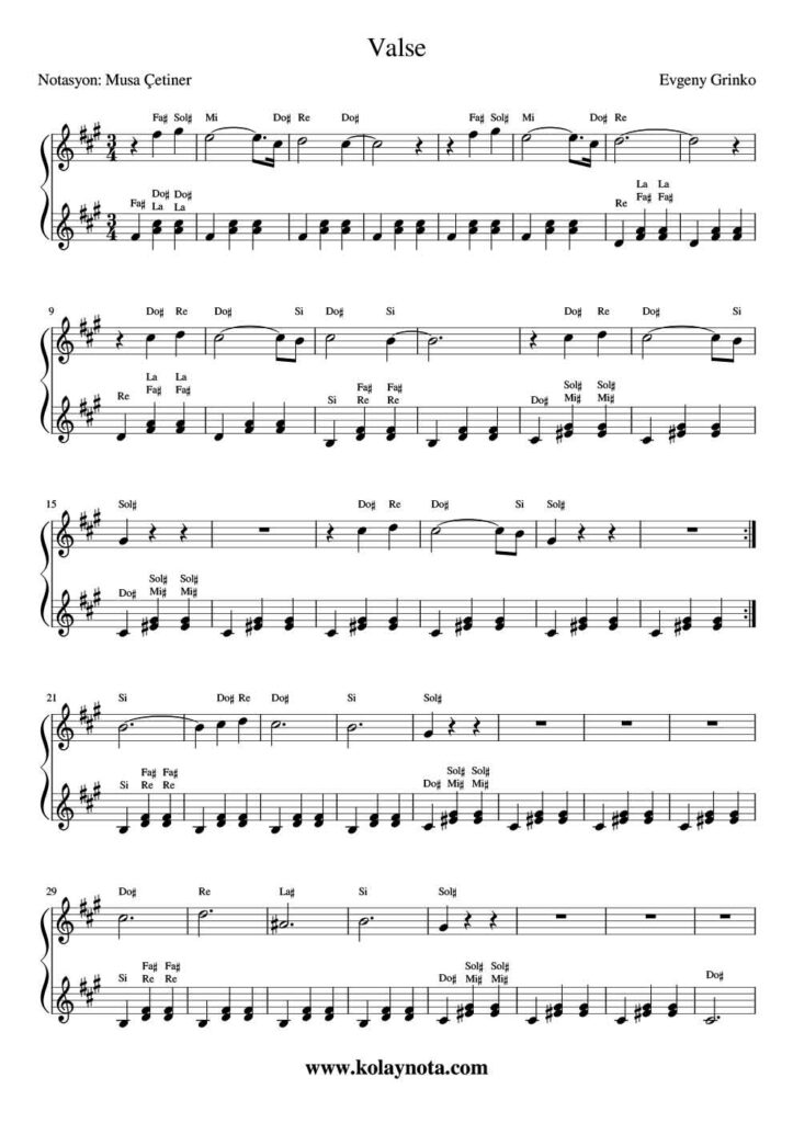 Vals veya “Valse” Evgeny Grinko’nun ülkemizde çok sevilen bir piyano şarkısı. Standart versiyon ve kolay nota versiyonunu hazırladım. Kolay notada notaların üzerinde nota isimleri yazıyor. Videosunu da ekliyorum. Youtube kanalıma da abone olursanız sevinirim. Başarılar