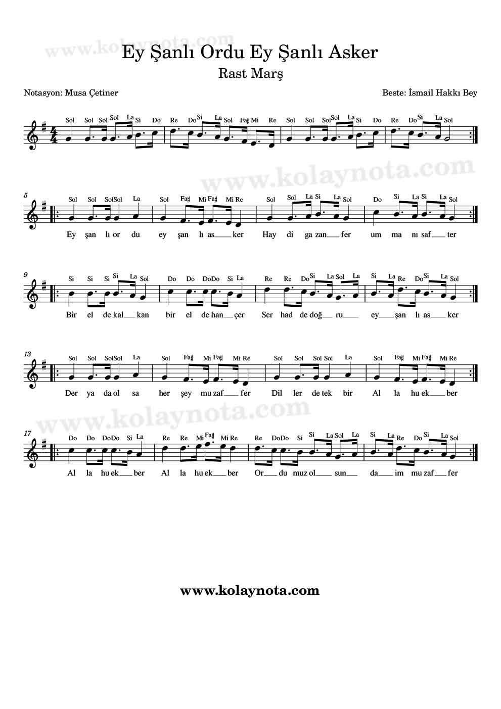 Ey Şanlı Ordu Ey Şanlı Asker (Eski Ordu Marşı); Rast makamında bir marş. Bestecisi İsmail Hakkı Bey ki kendisi hepinizin çok iyi bildiği “Fikrimin İnce Gülü” şarkısının da bestecisi. Sol Karar sesinde Do Re Mi ve Kolay Notasını hazırladım. Ses dosyasını da ekliyorum, marşı bilmiyorsanız melodisini dinleyiniz.