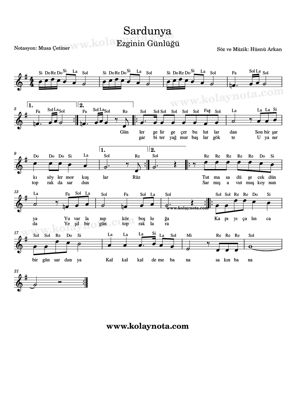 Sardunya, Nota. Ezginin Günlüğü grubunun bir şarkısı. Sözü ve müziği Hüsnü Arkan’a ait. Sol Karar sesinde yorumlanmış, aynı karar seste notaya aldım. Keman, piyano, melodika, flüt, org gibi çalgılarda çalabilir, notayı dinleyebilirsiniz, PDF ve imaj biçimlerinde görüntüleyebilirsiniz.