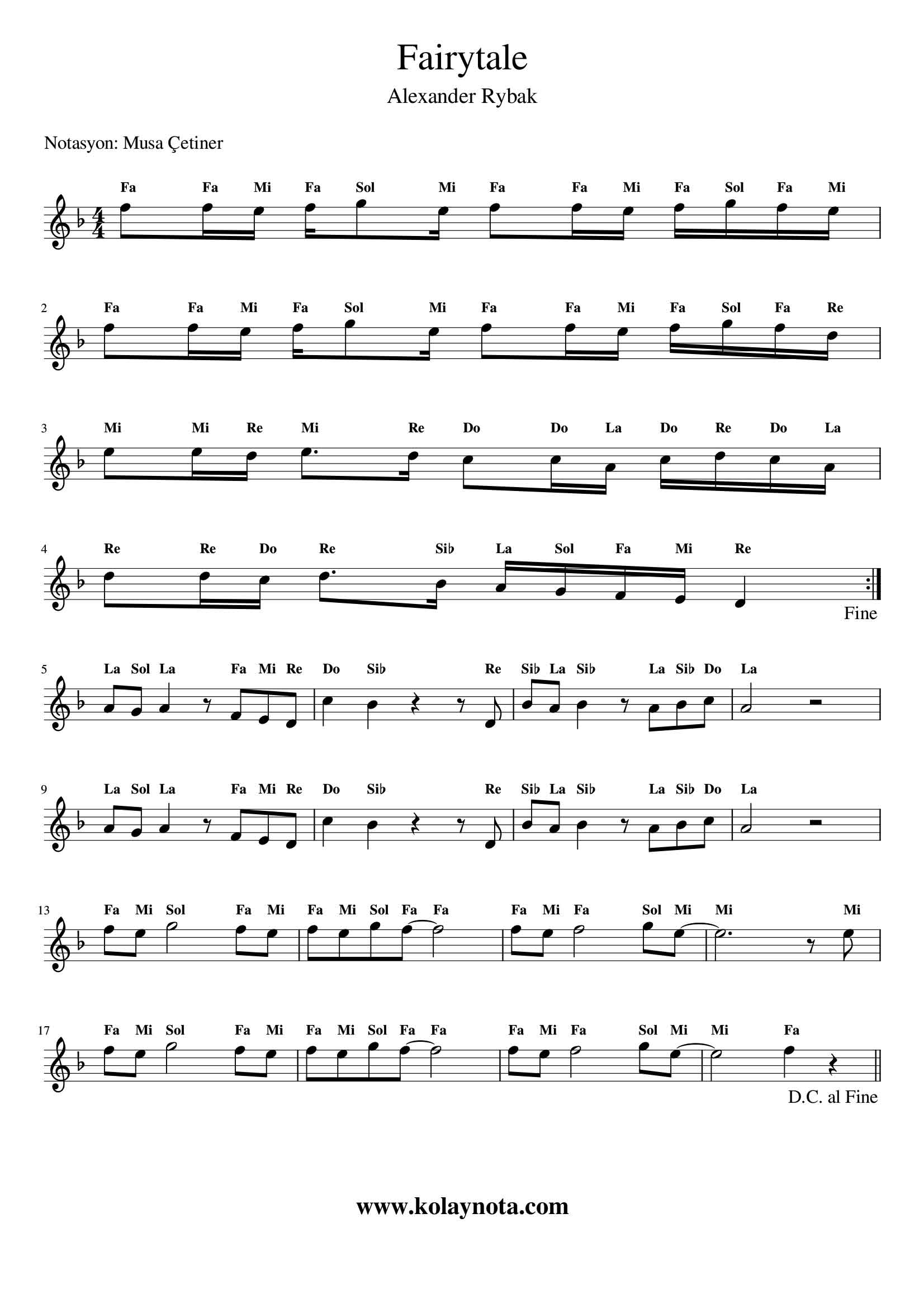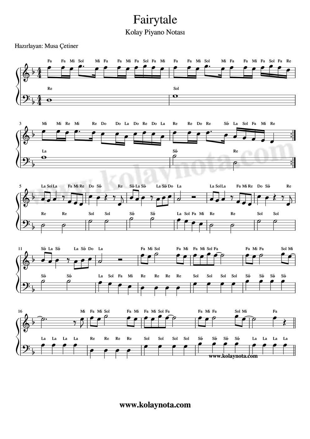 Fairytale; Alexander Rybak‘ın Eurovision şarkı yarışmasında birinci olduğu şarkı. Girişteki keman melodisiyle herkesin aklında yer etmişti. Kolay notasını ve kolay piyano düzenlemesini paylaşıyorum. Nota çalıcısında dinleyip melodi hakkında bir fikir sahibi olabilirsiniz. Piyano düzenlemesinin videosunu da ekleyeceğim.