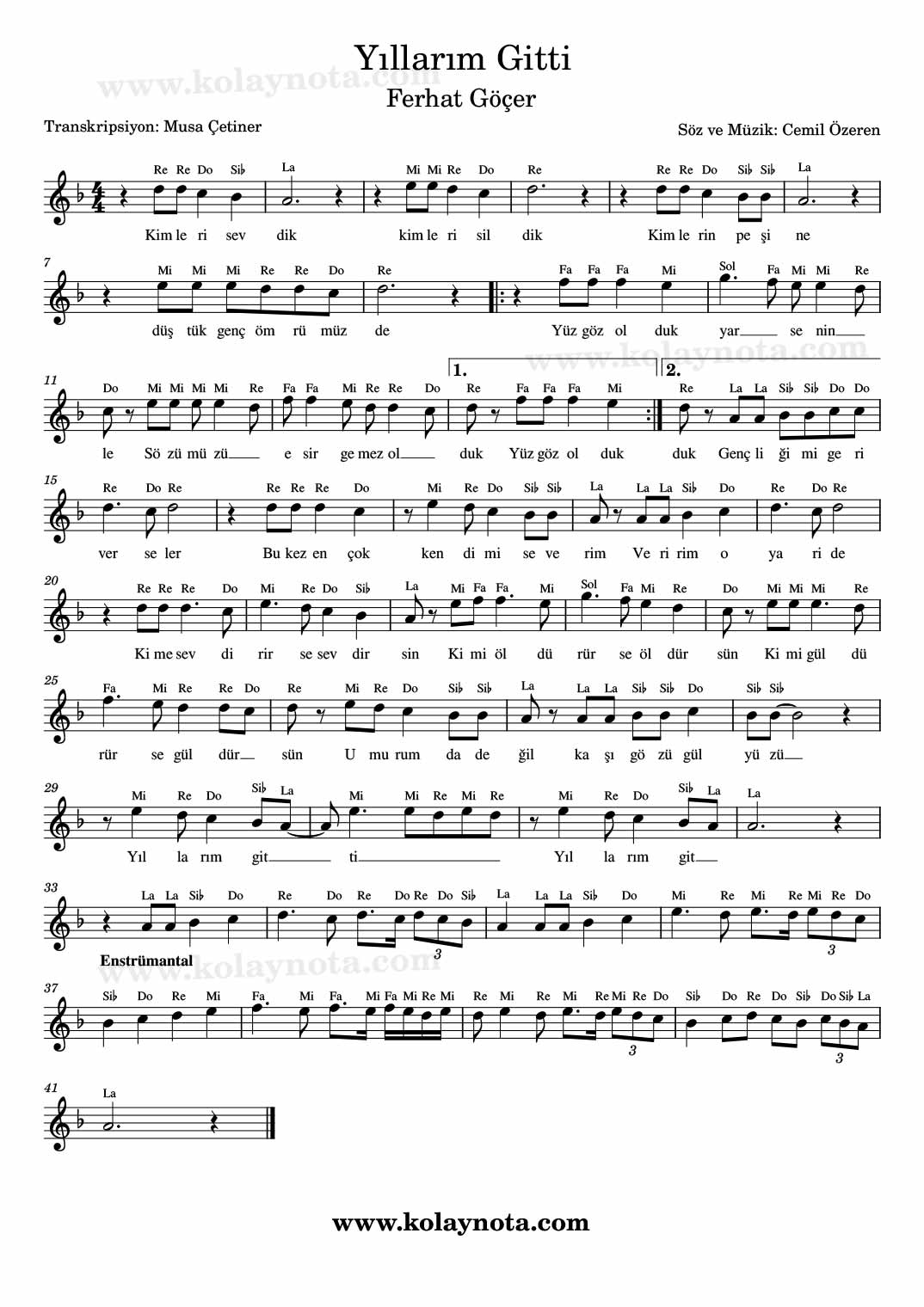 Yıllarım Gitti, Nota. Sözü ve müziği Cemil Özeren’e ait, Ferhat Göçer’in seslendirdiği bir şarkı. Kürdi makamında bestelenmiş. La Karar sesinde notaya aldım. Şarkı “Gençliğimi Geri Verseler” adıyla da biliniyor. Do Re Mi ve Kolay notasyonunu görebilirsiniz yazının içeriğinde.