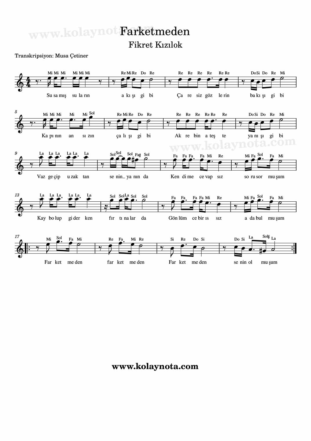 Farketmeden, Nota. 2001 yılında kaybettiğimiz Fikret Kızılok’un bir şarkısı. 1995 yılında piyasaya sürülen “Yadigar” isimli albümde yer almış. La minör tonunda notaya aldım. Do Re Mi ve Kolay notasyonunu görebilirsiniz.