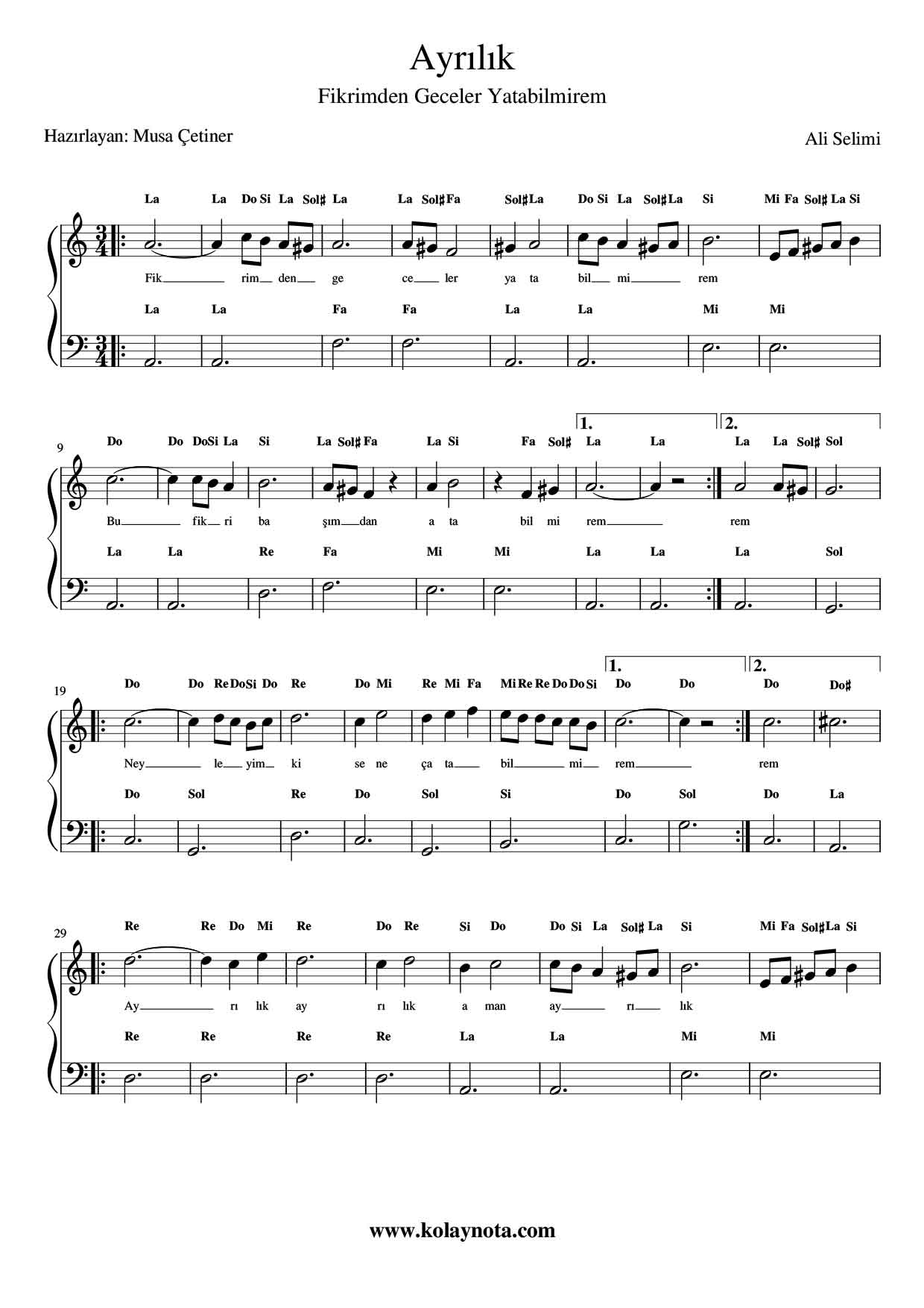 Fikrimden Geceler ya da bilinen diğer adıyla “Ayrılık” bestesi Ali Selimi‘ye ait olan bir şarkı. Kolay Piyano biçiminde düzenledim. Videosunu da ekliyorum, şarkının çalınışı hakkında fikir sahibi olabilirsiniz. Başarılar.