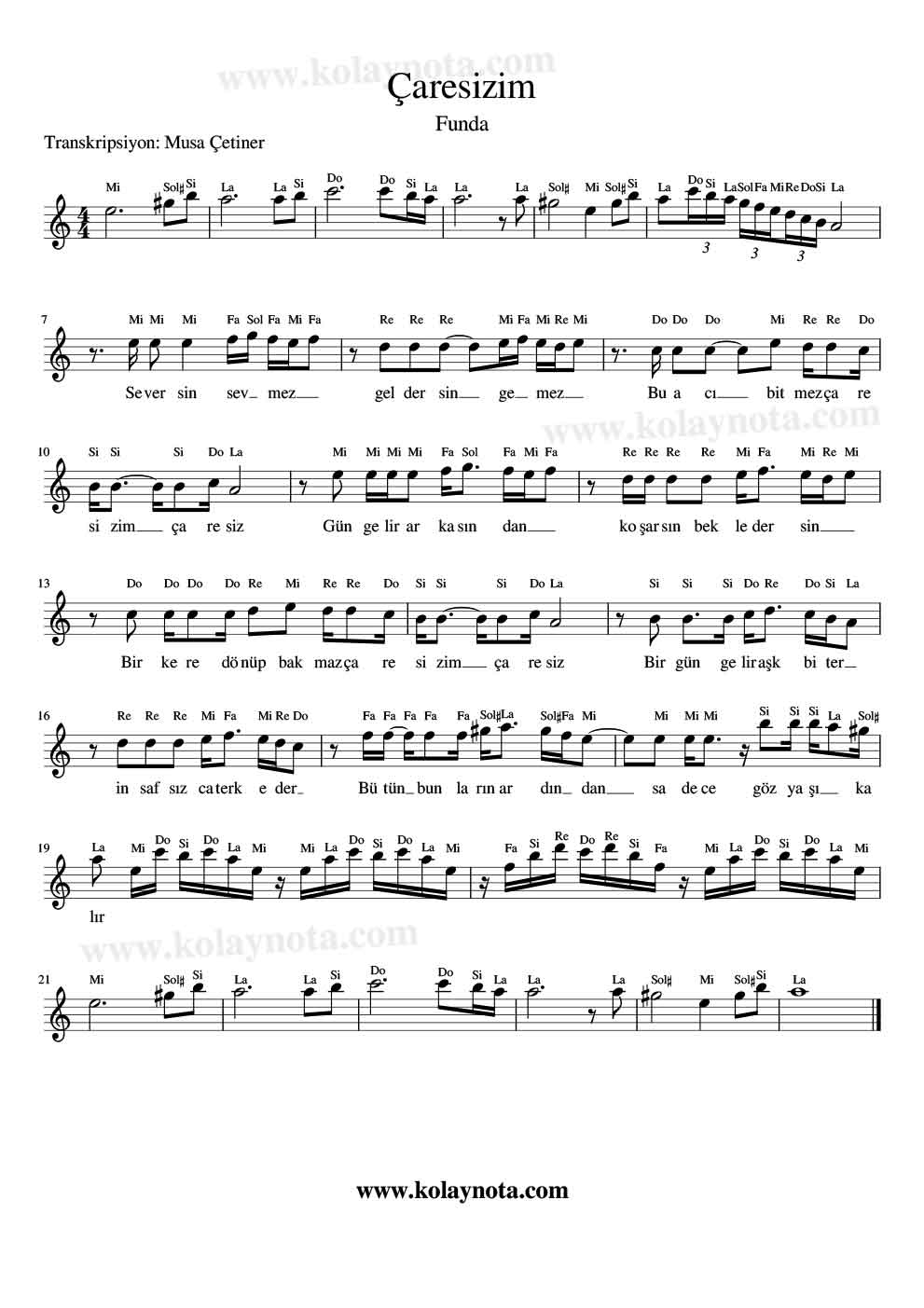 Çaresizim Funda’nın bir şarkısı. 1976 yılında çıkan aynı adlı plakta yer almış. Sonrasında Zuhal Olcay ve Göksel tarafında tekrar yorumlanmış. La minör tonunda notaya aldım. Do Re Mi ve Kolay Notasını hazırladım. Aynı zamanda piyano düzenlemesini de görebilirsiniz.