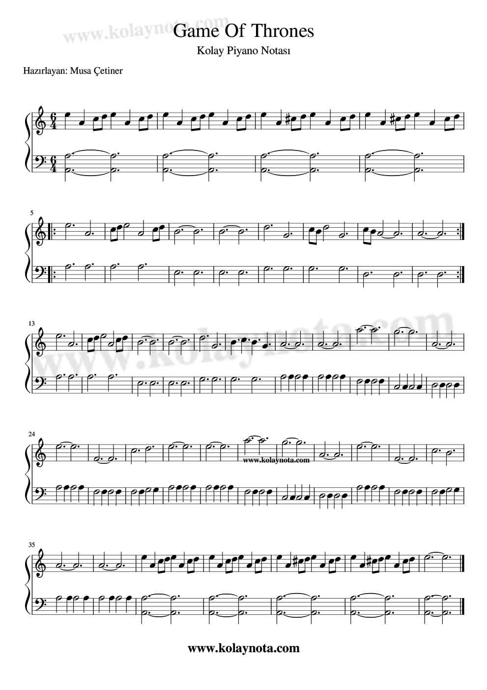 Game Of Thrones » 8 sezon süren efsane dizinin müziğini hepiniz biliyorsunuzdur. Diziyi izlemeyenler bile biliyor. Ben diziyi izlemeden önce müziğini duymuştum örneğin. Kolay Piyano Notası olarak düzenledim. 2 versiyon var. Birinde nota isimleri yazıyor, diğerinde yazmıyor. Hangisini tercih ederseniz. Orjinal tonu Do minör fakat bemollü notalarla uğraşmayın diye La minör olarak düzenledim.