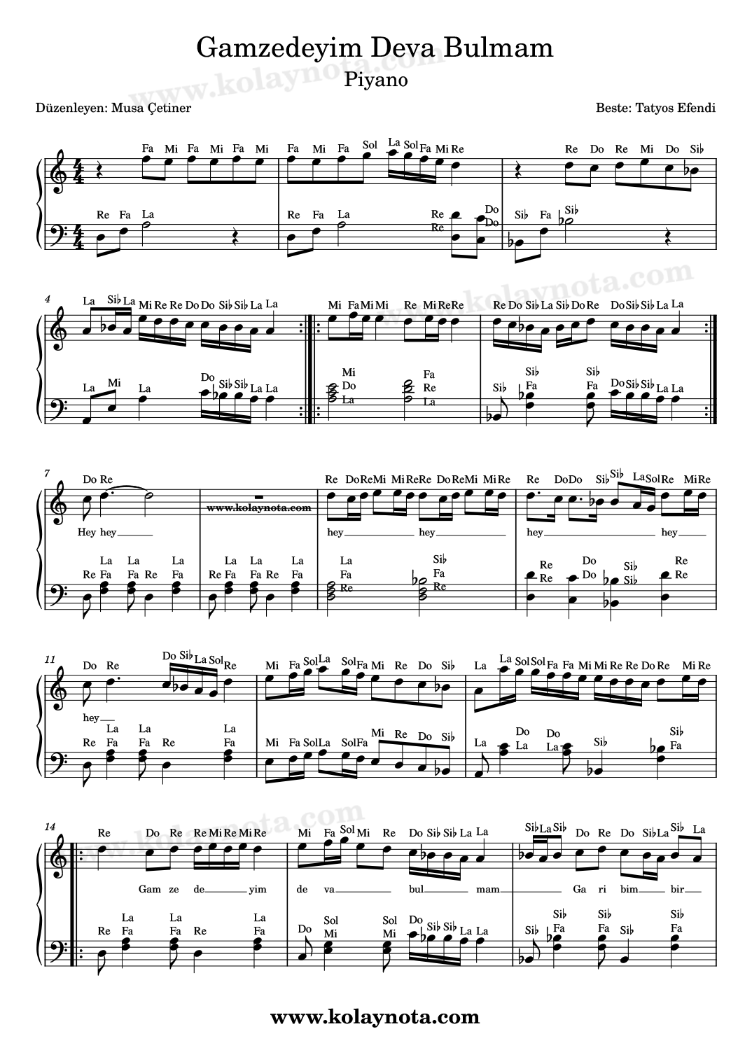 Gamzedeyim Deva Bulmam – Piyano Notası