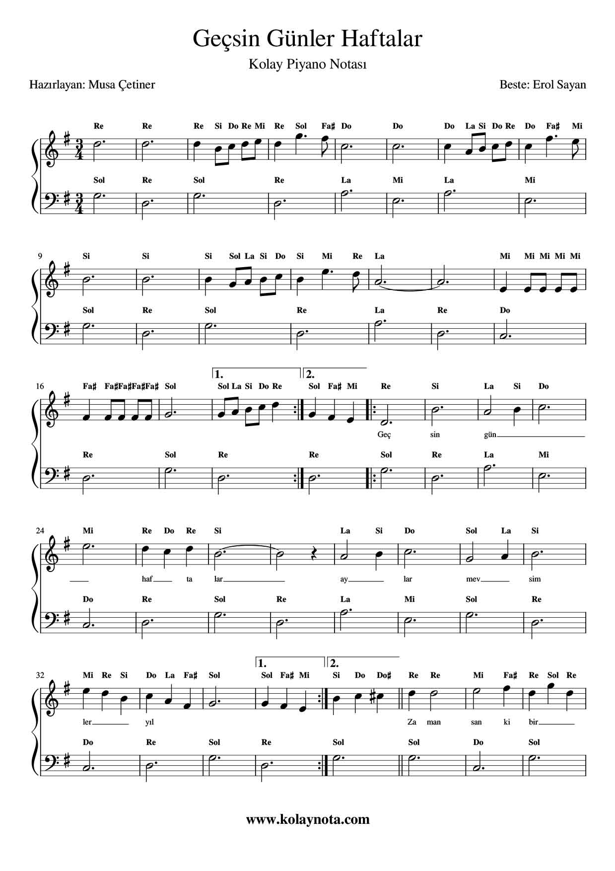 Geçsin Günler Haftalar Kolay Piyano Notası