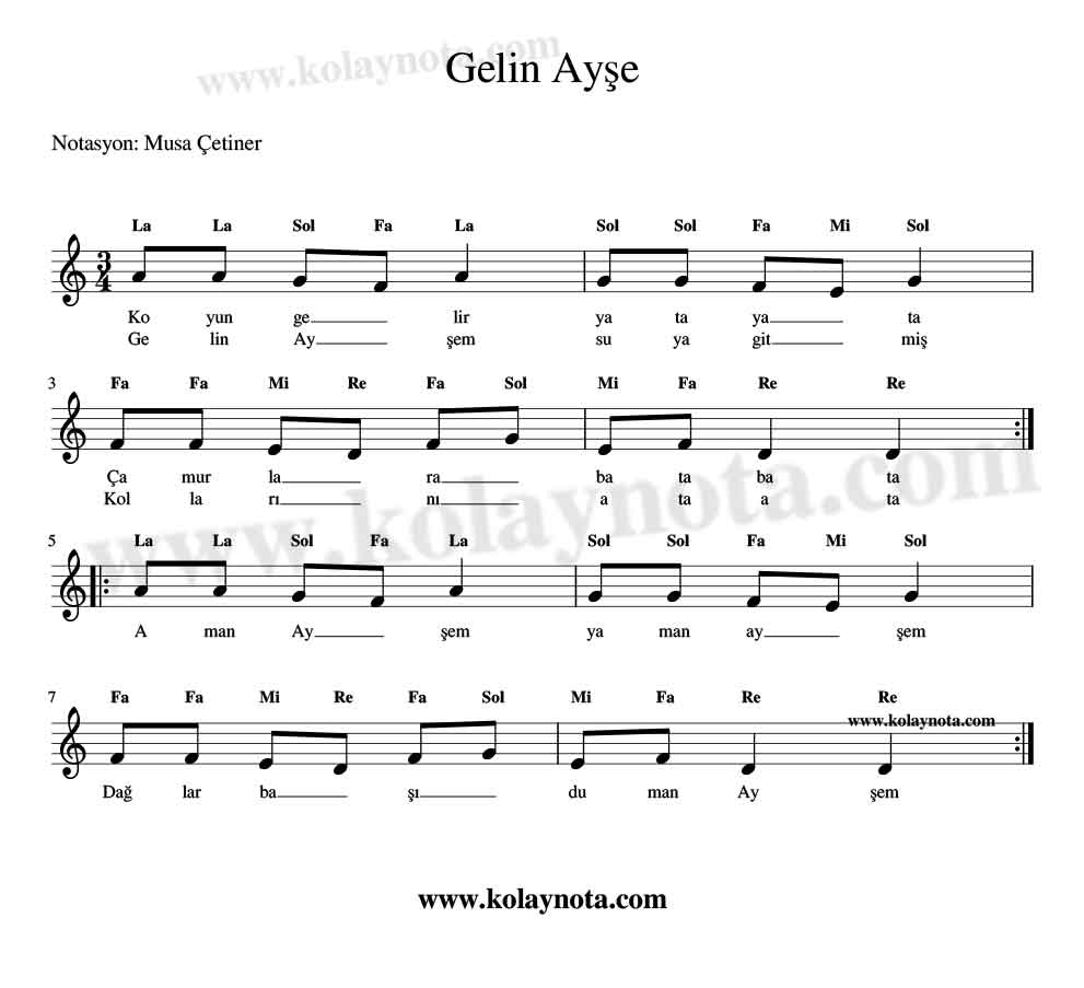 Gelin Ayşe kısa, basit ve çok akılda kalan bir melodiye sahip güzel bir türkü. Türkünün Do Re Mi nota ve Kolay notalarını paylaşacağım bu yazıda. Ses dosyasını da ekliyorum, dinlemeniz gerekebilir.