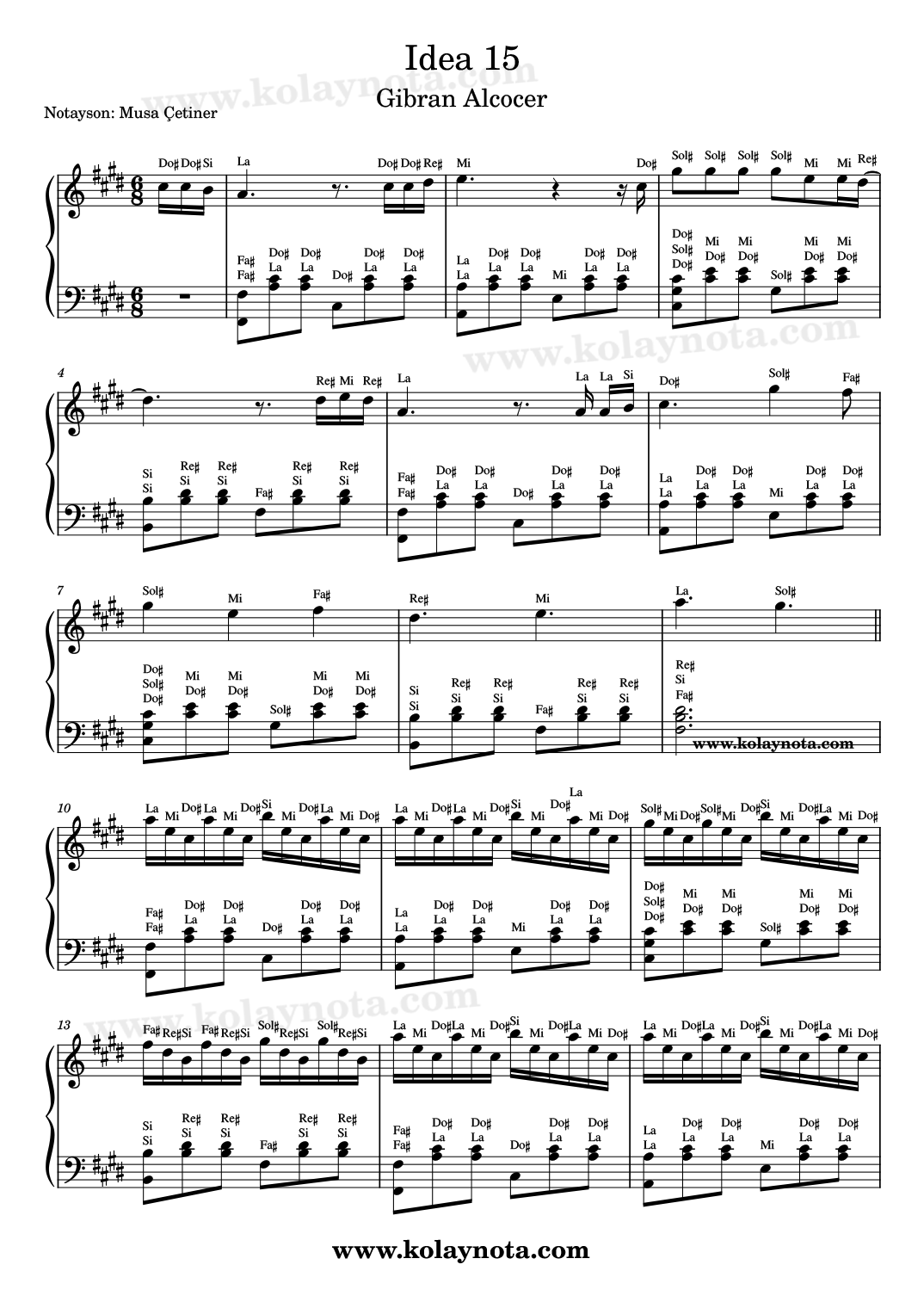 Idea 15, Piyano Nota. Gibran Alcocer’in bir bestesi. Do# minör tonunda bir parça. Orjinal notasyondan yola çıkarak hazırladım buradaki notasyonu. Sadece üstüne nota isimlerini ekledim. Sanatçının daha önceden hazırladım Idea 10 ve Idea 22 eserlerine ilgili linklerden ulaşabilirsiniz.