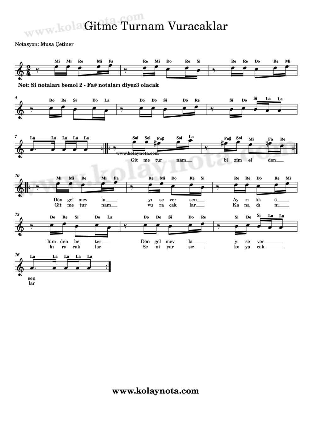 Gitme Turnam Vuracaklar türküsünü melodika, keman, org, flüt, bağlama çalgılarında, do re mi ve kolay notalarına bakarak çalabilirsiniz. Başarılar.