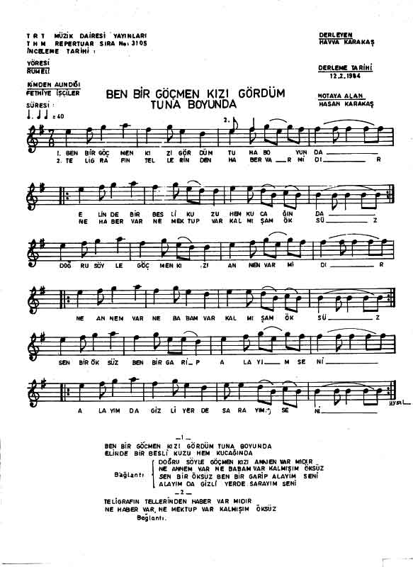 Göçmen Kızı; 7/8 ölçüde ve Rumeli yöresine ait bir türkü. Do Re Mi notasyonunu paylaşacağım. Melodika, keman, org, flüt gibi çalgılarda kolaylıkla çalabilirsiniz. Sayfanın en altına TRT notasını da ekleyeceğim, bağlama çalan arkadaşların işine yarayabilir. Başarılar.