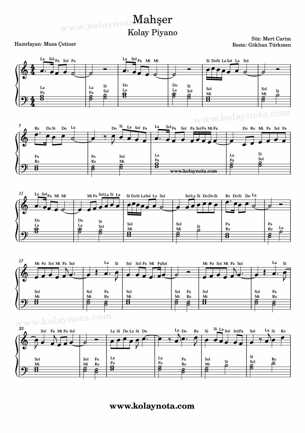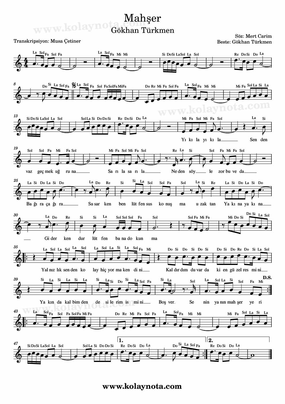 Mahşer, Nota. Gökhan Türkmen’in bestesi kendisine, sözleri Mert Carim’e ait bir şarkısı. Kürdi dizisinde bestelenmiş ve Mi karar sesinde yorumlanmış. Aynı karar seste notaya aldım. Kolay nota ve piyano düzenlemesini görebilirsiniz bu yazıda.