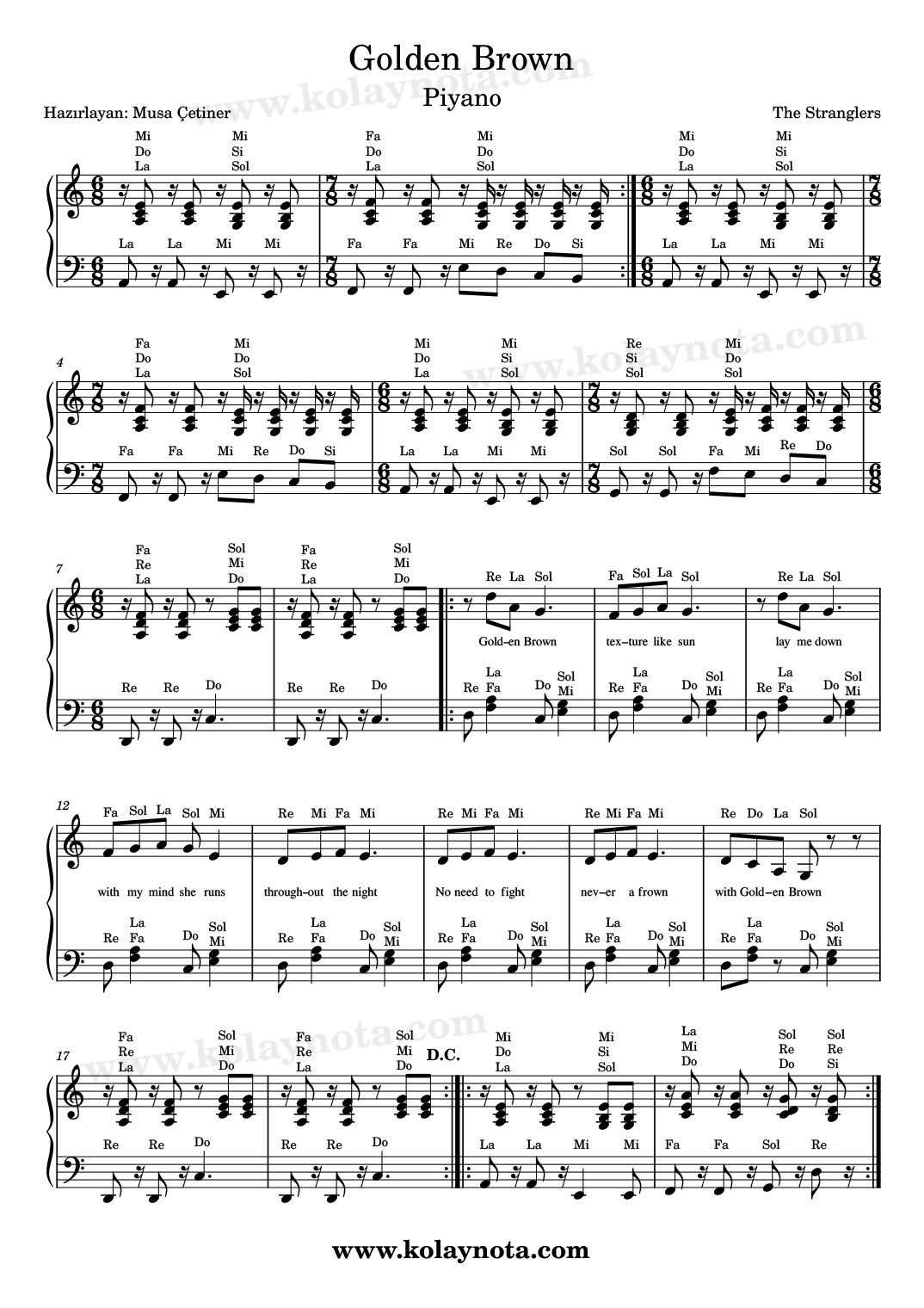 Golden Brown, Nota. The Stranglers’in şarkısı. Si bemol minör tonunda bir şarkı. Ben La minör tonunda notaya aldım. Piyano düzenlemesini görebilirsiniz bu yazıda. Biraz kısaltarak düzenledim, şarkının ana fikri anlaşılıyor düzenlemede.