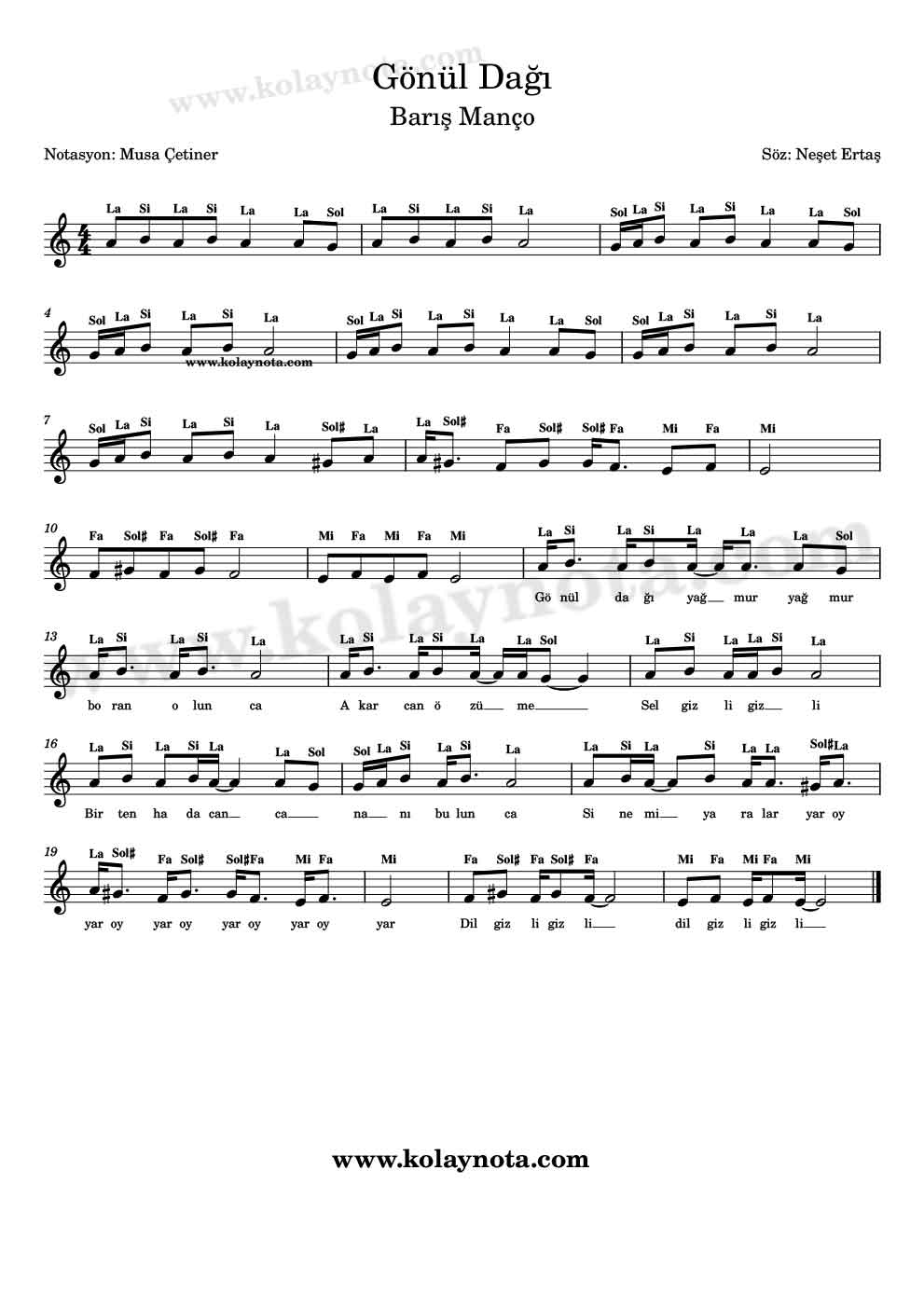 Gönül Dağı; sözlerini Neşet Ertaş‘ın yazdığı anonim bir türkü. Barış Manço yorumunu ekleyeceğim bu yazıda. Do Re Mi nota ve kolay nota biçiminde paylaşıyorum.