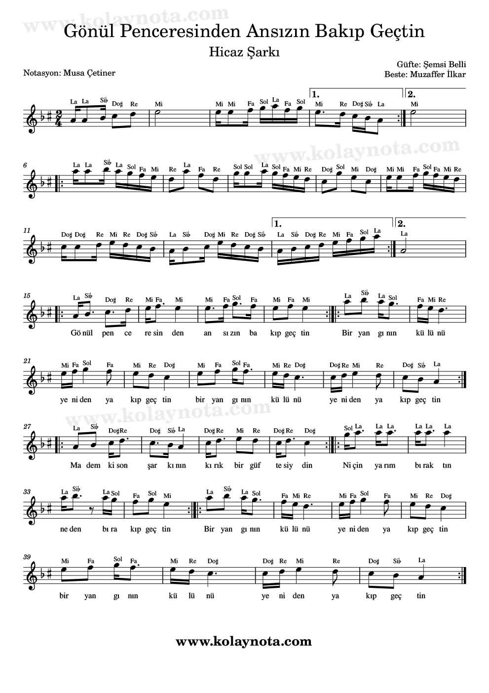 Gönül Penceresinden Ansızın Bakıp Geçtin; güftesi Şemsi Belli, bestesi Muzaffer İlkar’a ait olan, Hicaz makamında bir şarkı. “Bir Yangının Külünü” adı ile de biliniyor. La Karar sesinde Do Re Mi ve Kolay Notasını hazırladım. Do Re Mi notasyonda sadece sözlü bölümler var, kolay notası daha geniş bir versiyon. Nota çalıcısını da ekleyeceğim, dinleyip daha doğru bir şekilde çalabilirsiniz.