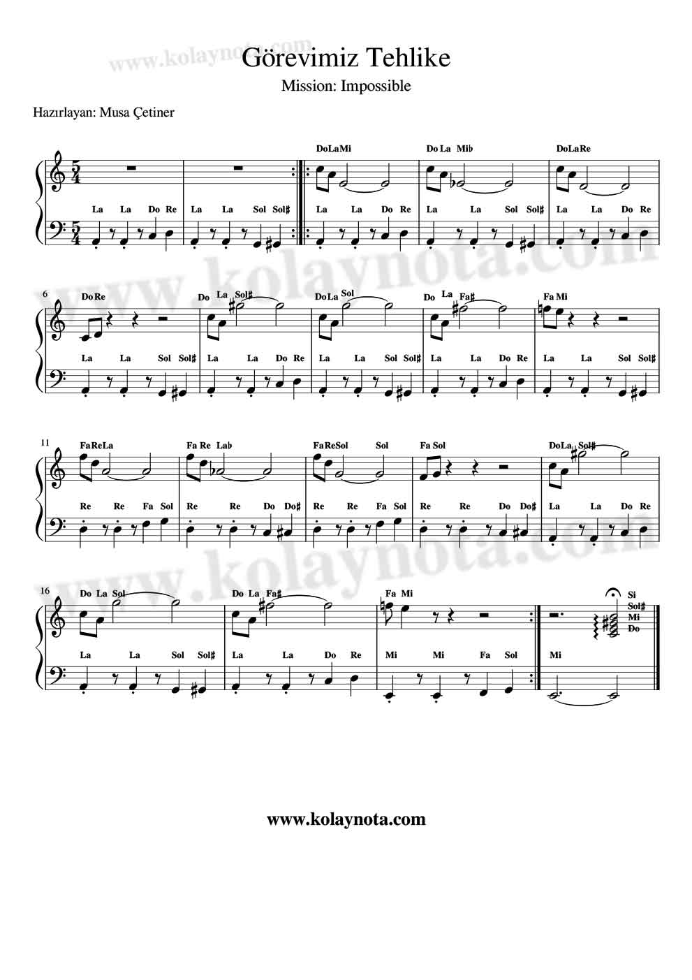 Görevimiz Tehlike “Mission Impossible” dizisinin ve filminin müziğini hepiniz biliyorsunuzdur. Do Re Mi notaları ve piyano notalarını paylaşacağım. Piyano düzenlemesini kolay piyano formatında hazırladım, yine de sol el biraz zorlayabilir. Videosunu da ekliyorum, yavaş temposunu izleyip kolayca çözebilirsiniz. Melodika çalan arkadaşlar da videodan faydalanabilirler.