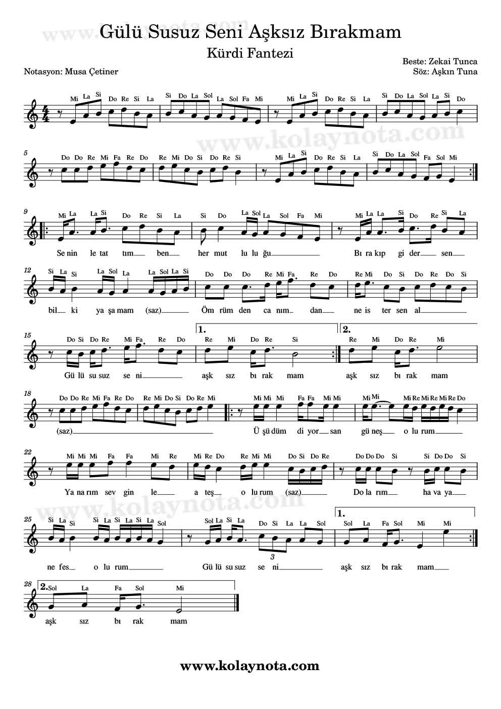 Keman, Ud, Flüt, Melodika, Org Notaları. Gülü Susuz Seni Aşksız Bırakmam ya da bilinen diğer adıyla “Seninle Tattım Ben Her Mutluluğu“. Sözleri Aşkın Tuna, bestesi Zekai Tunca‘ya ait olan bir eser. Kürdi makamında bir şarkı. La Karar sesinde kolay notasını hazırladım. Nota isimleri notaların üzerinde yazıyor.