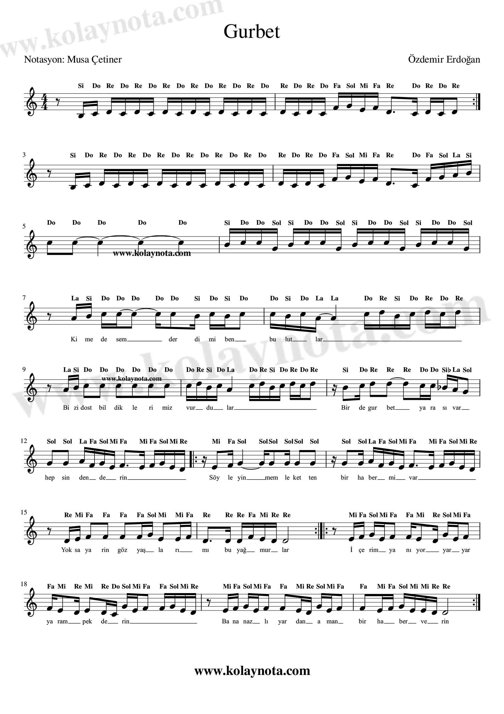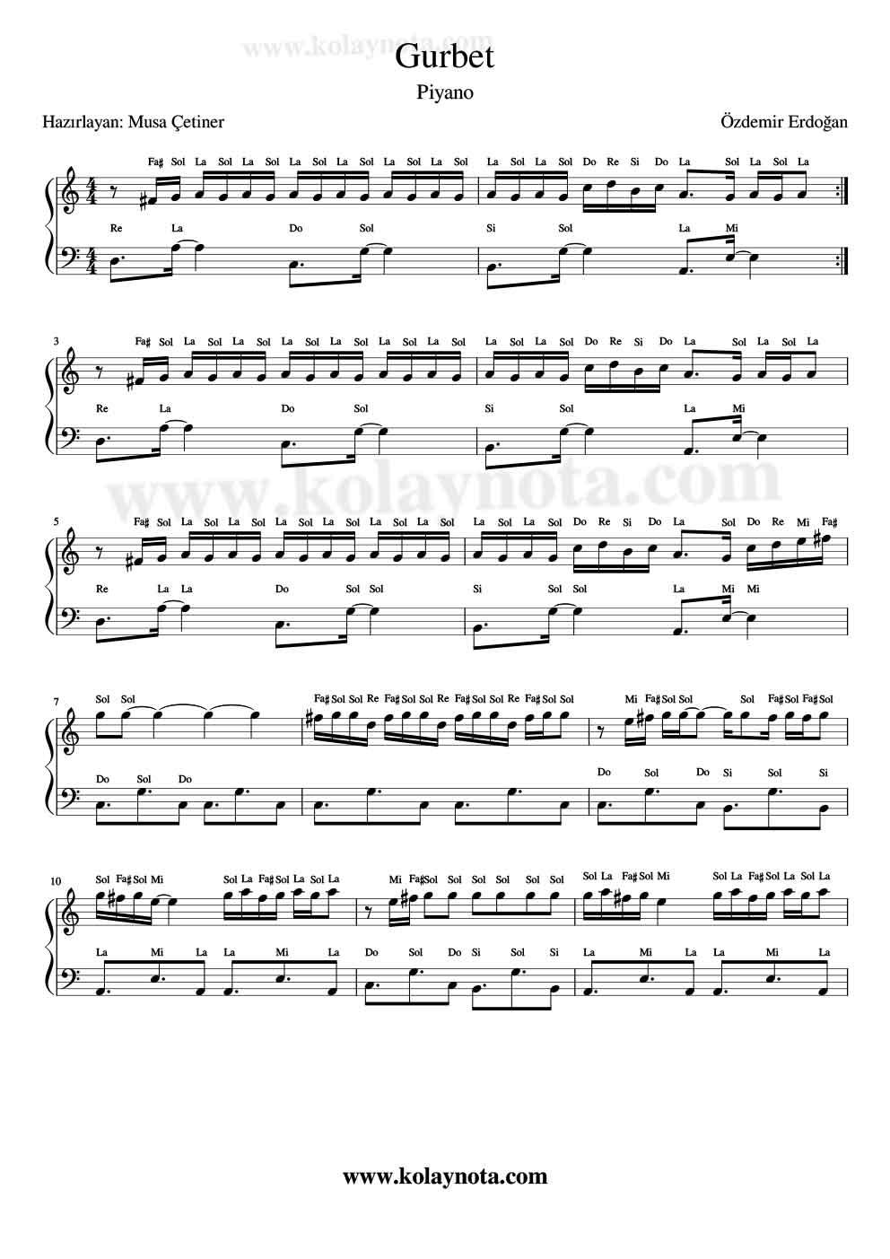Melodika, Keman, Org, Flüt Notaları. Gurbet şarkısı Özdemir Erdoğan‘ın çok önemli bir bestesi. Kolay Notasını ve Piyano Notasını paylaşacağım. Kolay Notasını Re Karar sesinde yazdım.