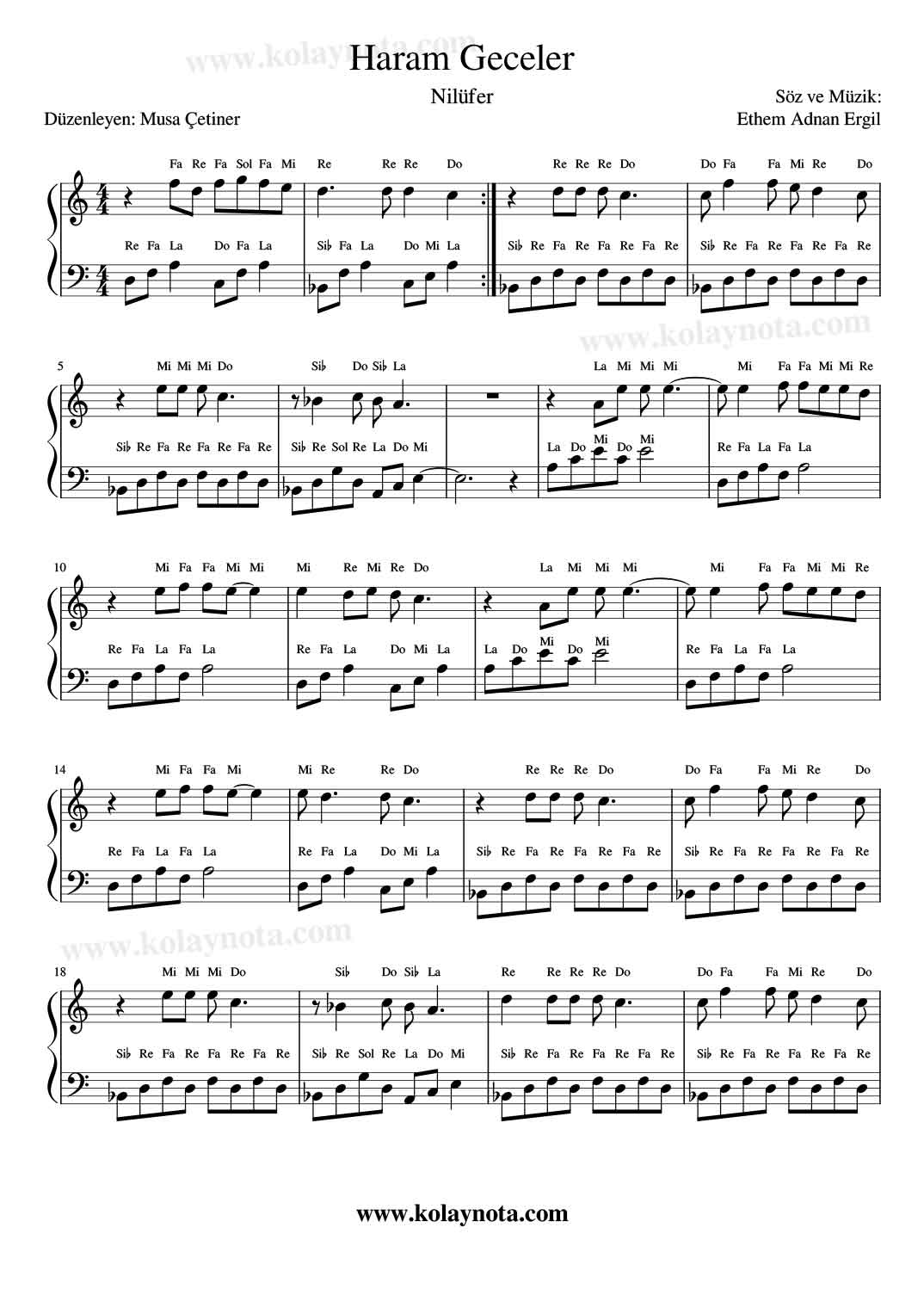 Haram Geceler Piyano Notası