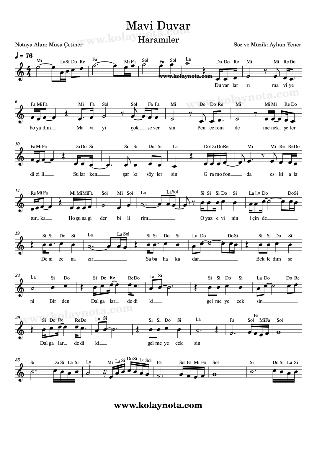 Mavi Duvar, Nota. Haramiler grubunun bir şarkısı. Sözü ve müziği Ayhan Yener’e ait. La karar sesinde yorumlanmış, aynı karar seste notaya aldım. Keman, piyano, melodika, flüt, org gibi çalgılarda çalabilirsiniz. Notasyonu PDF ve imaj biçiminde görebilir, dinleyerek çalışabilirsiniz.