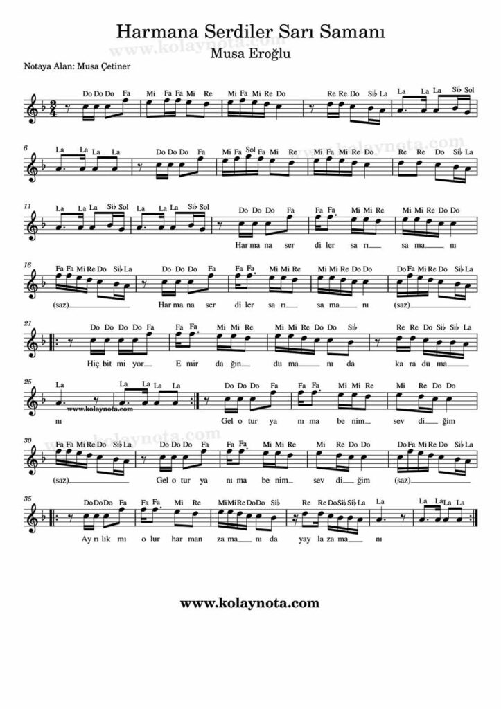 Harmana Serdiler Sarı Samanı – Kolay Nota by Musa Çetiner