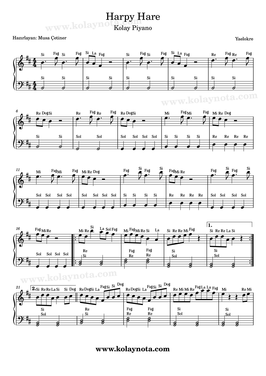 Harpy Hare, Piyano Notası. Yaelokre’nin bir şarkısı. Si minör tonunda bir şarkı. Kolay piyano biçiminde düzenledim. Sol elde tek sesli ve bazı yerlerde 2 sesli bir eşlik var. Youtube kanalımdaki videosunu izleyerek doğru bir şekilde çalışabilirsiniz. PDF ve imaj formatlarında görüntüleyebilir, piyano ile çalabilirsiniz.
