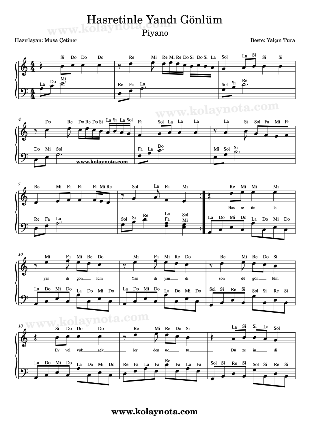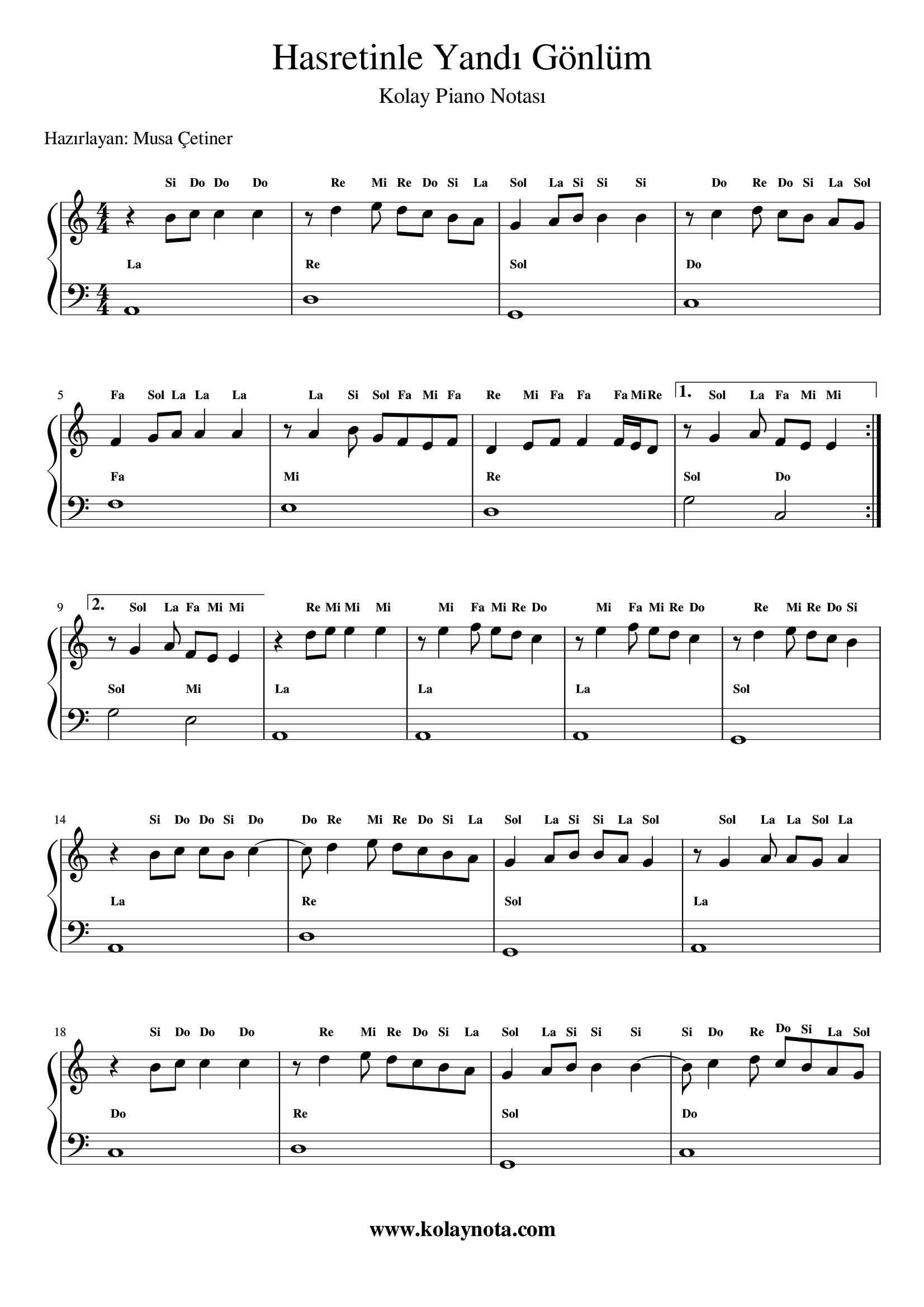 Hasretinle Yandı Gönlüm şarkısını kolay piyano biçiminde düzenledim. Pdf ve jpg olarak görüntüleyebilir, videosu sayesinde doğru olarak çalabilirsiniz.