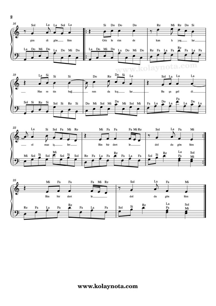 Hasretinle Yandı Gönlüm – Kolay Piyano Notası