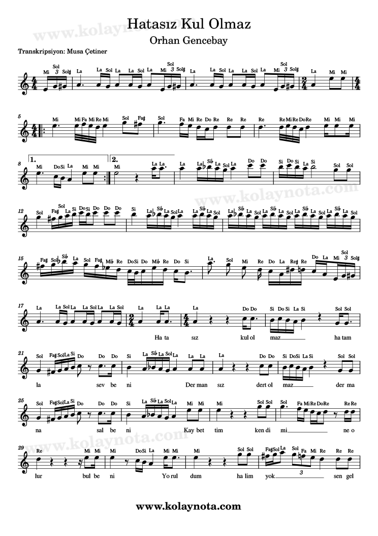 Hatasız Kul Olmaz Nota. Orhan Gencebay’ın efsane şarkısı. Sanatçının 1976 yılında çıkan albümünde yer almış. Uşşak makamında bir şarkı. Sİ karar sesinde yorumlanmış, ben LA karar sesinde yazdım.