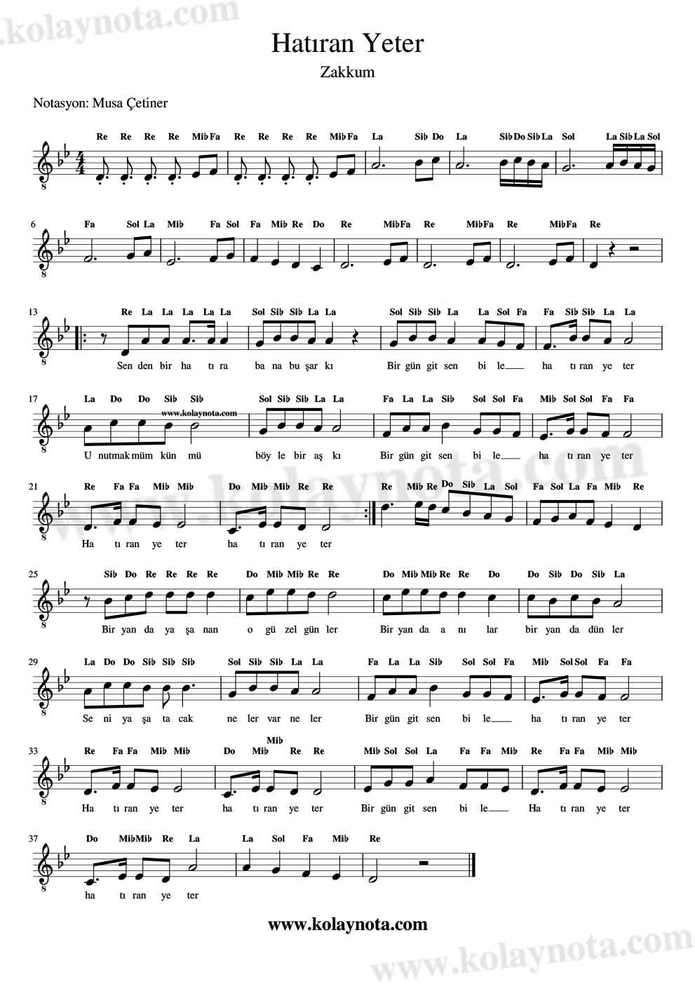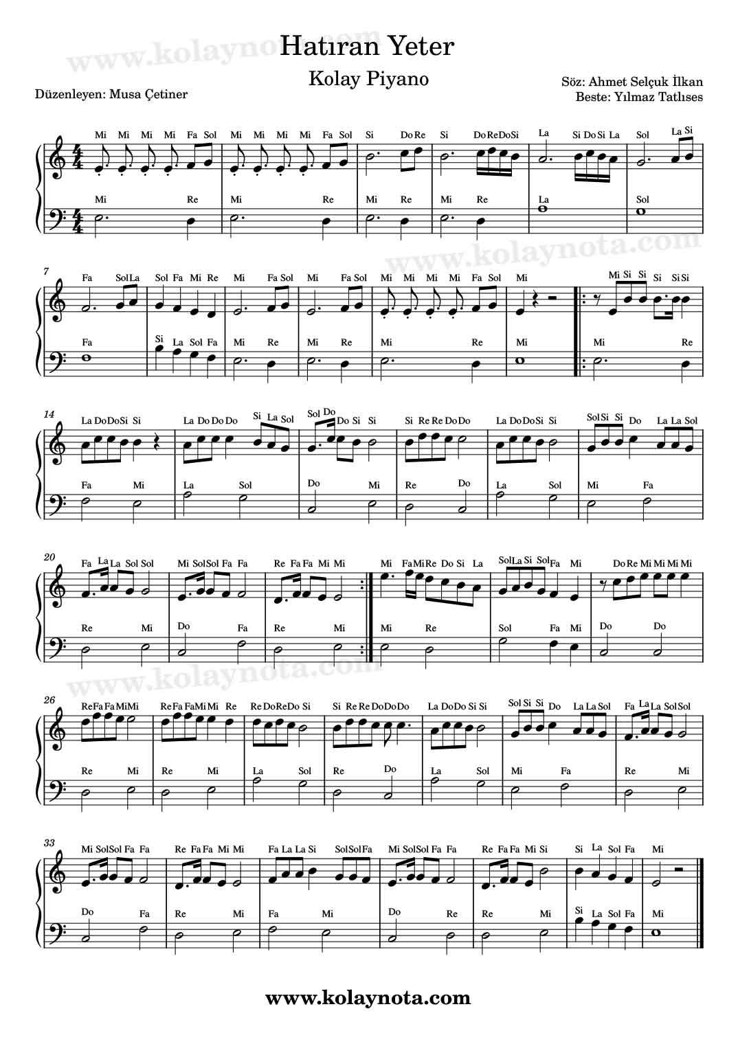 Hatıran Yeter Nota. Sözleri Ahmet Selçuk İlkan, bestesi Yılmaz Tatlıses’e ait olan bir şarkı. 70’li yıllarda Ferdi Tayfur ve Gülden Karaböcek seslendirmiş, yakın sayılabilecek bir zamanda ise Zakkum tarafından yorumlanmış bir şarkı. Kürdi dizisi üzerine bestelenmiş. Re karar sesinde kolay ve Mi karar sesinde piyano notasını hazırladım