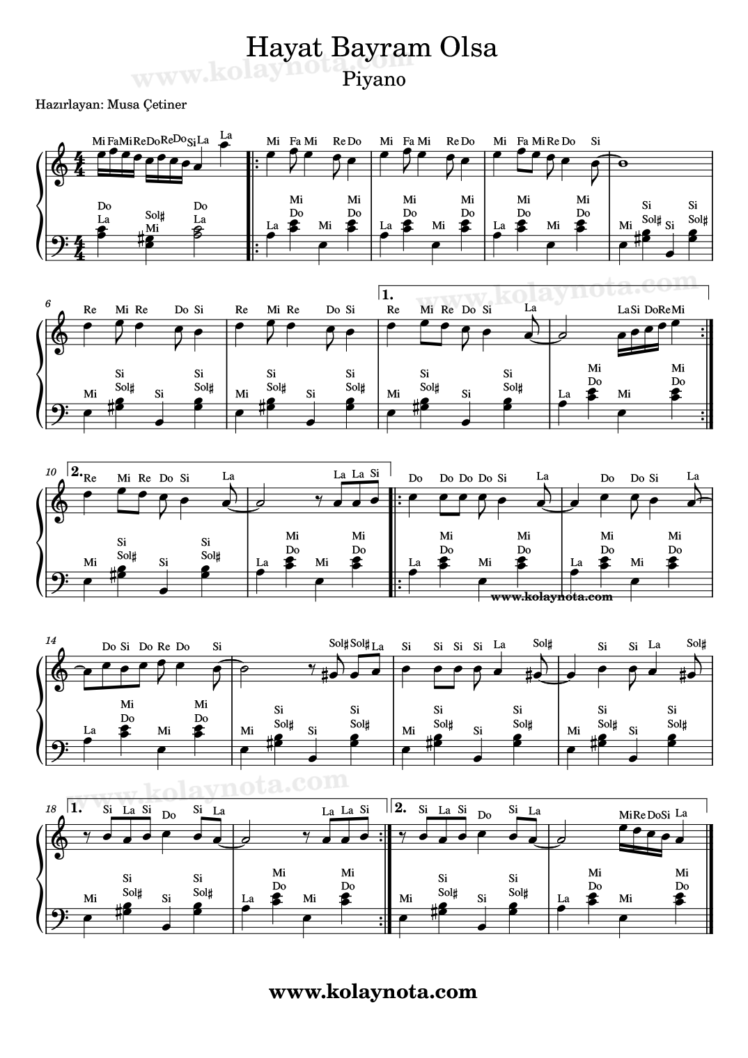 Hayat Bayram Olsa Kolay Piyano Notası