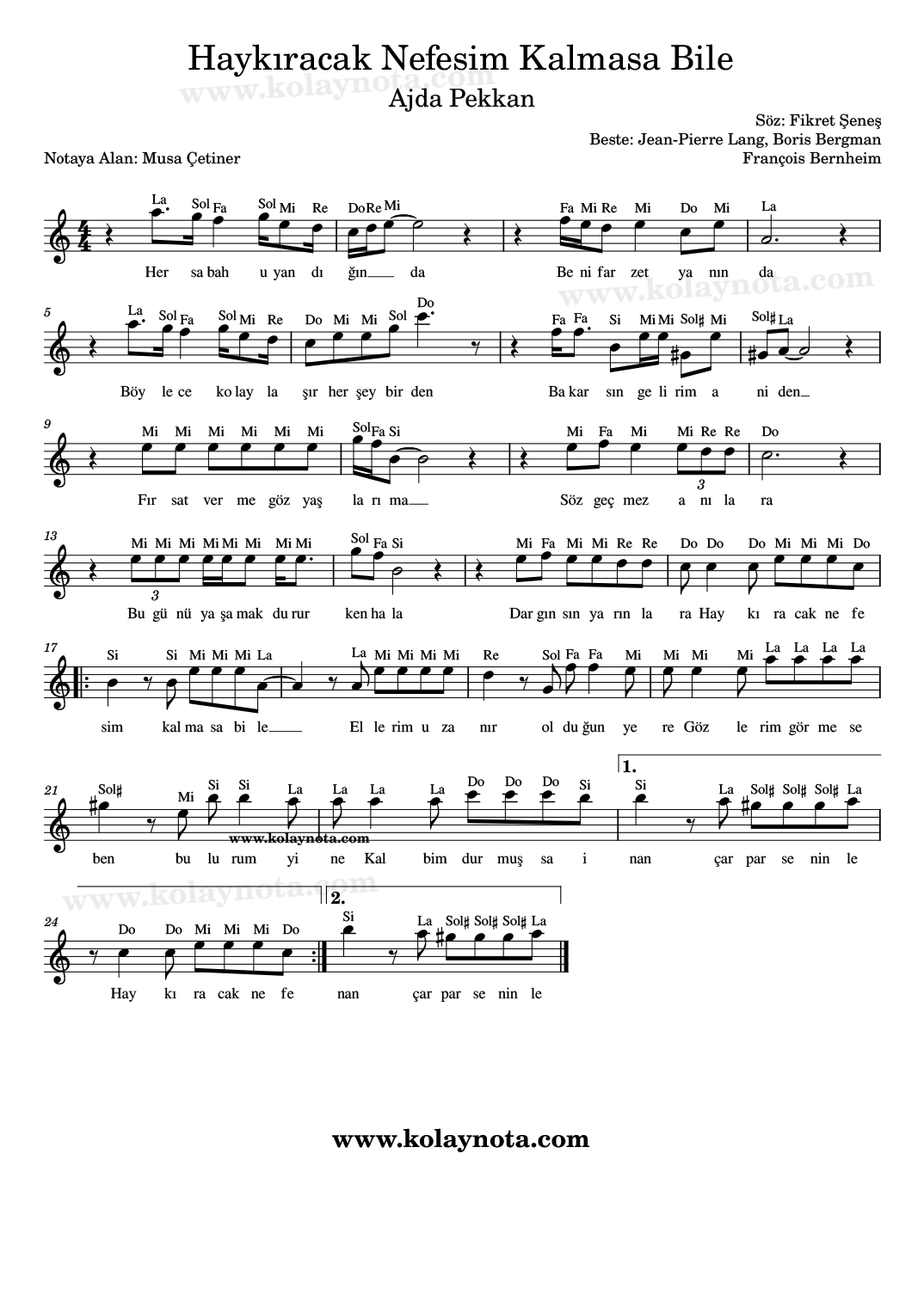 Haykıracak Nefesim Kalmasa Bile, Nota. Ajda Pekkan’ın bir şarkısı. Türkçe sözleri Fikret Şeneş’e ait yabancı bir şarkı. Sanatçının 1979 yılında çıkan “Süperstar 2” albümünde yer almış. La minör tonunda notaya aldım. Keman, melodika, flüt, org, piyano gibi çalgılarda çalabilir, PDF ve imaj formatında görüntüleyebilirsiniz.