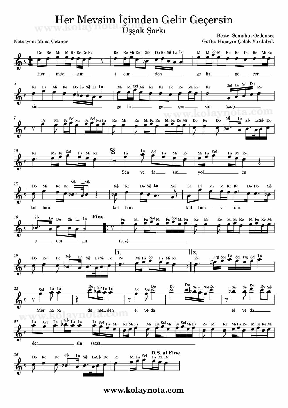 Her Mevsim İçimden Gelir Geçersin, Nota. Güftesi Semahat Özdenses, bestesi Hüseyin Çolak Yurdabak’ ait olan, Uşşak makamında bir şarkı. La karar sesinde notaya aldım. Uşşak makamında olduğu için Si notalarının 1 koma çalınması gerekli. Ben batı müziği sazlarını düşünerek Sib yazdım, türk müziği enstrümanı çalanlar Si notalarını komalı çalmalı. Kolay notasını görebilirsiniz yazının içeriğinde